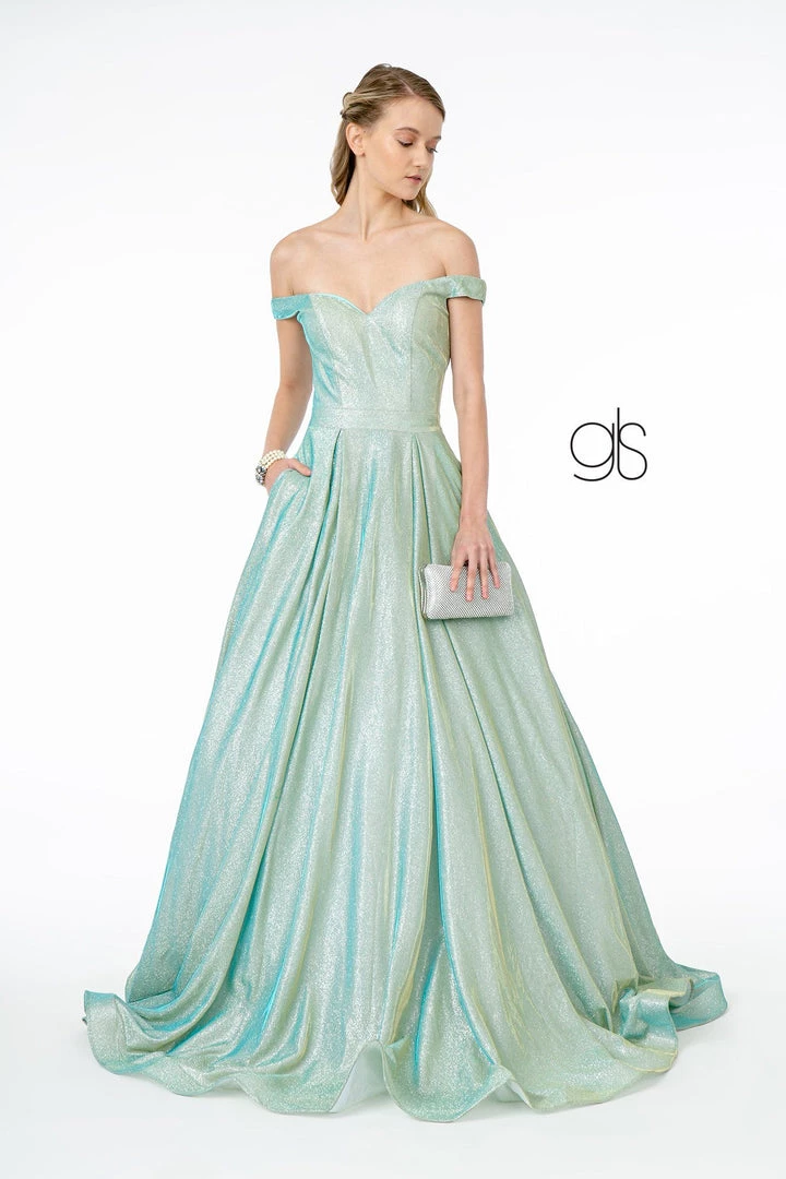 Dance the night away in thisĀ iridescent glitter long off the shoulder dress with A-line skirt by Elizabeth K GL2904. Affordably priced at $199, this gown is perfect for any formal event and will keep you on budget!