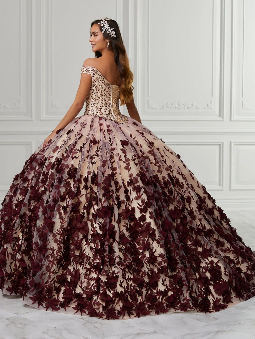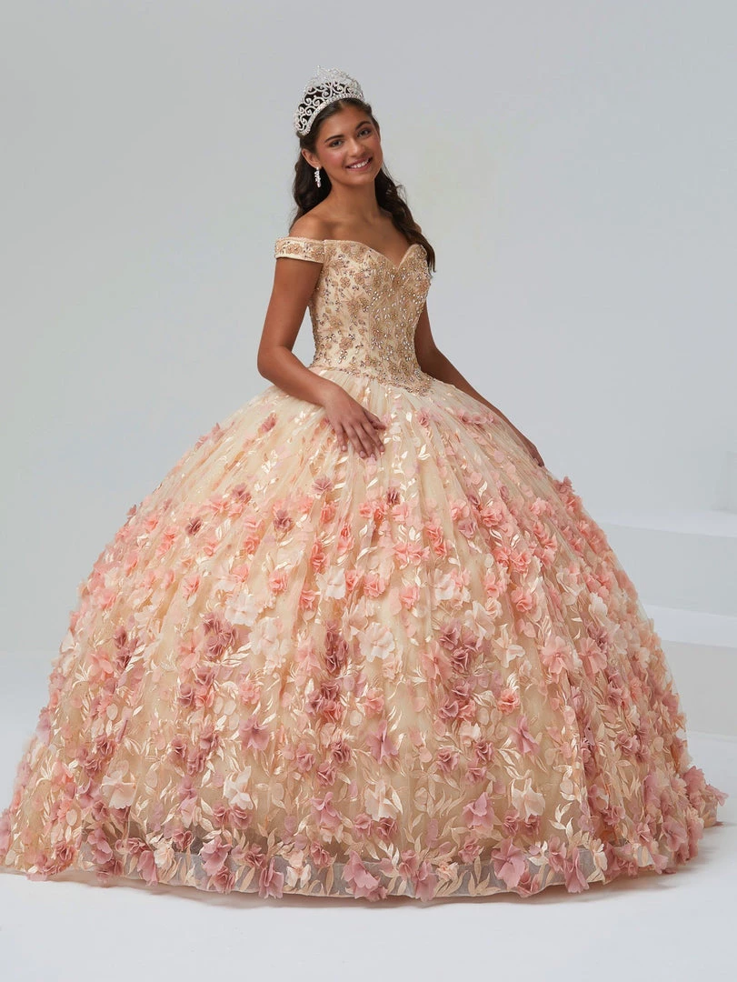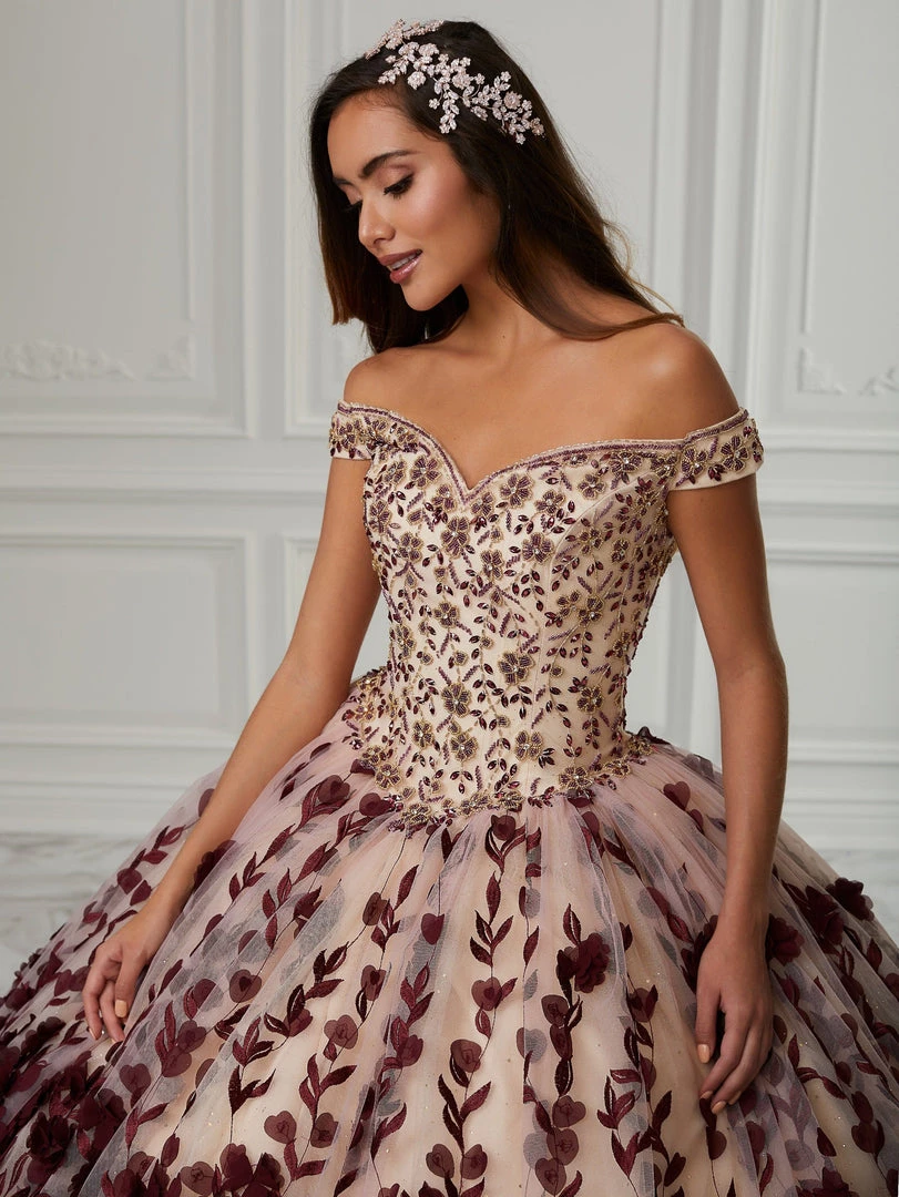 Make a grand entrance in this beaded long off the shoulder dress with A-line 3D floral applique skirt by House of Wu Quinceanera Collection 26990. Made out of tulle, this beautiful off shoulder ball gown features a sweetheart bodice adorned with sparkly beads, cap sleeves, open back, and a floor length A-line gathered skirt with 3D floral appliques. This look is finished with a lace-up corset back and a sweep train.