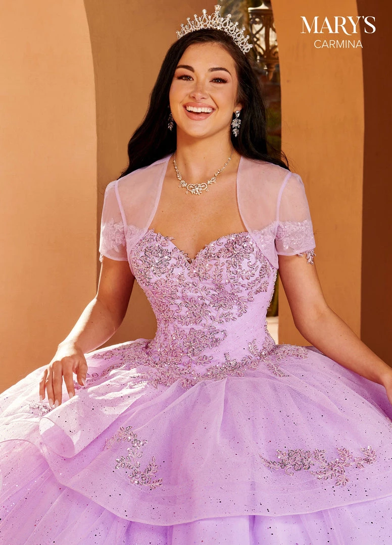 Look like a fairy-tale Princess in this beaded long off shoulder dress with A-line skirt by Mary’s Bridal Quinceanera MQ1104. This glitter tulle quinceanera ball gown features an off the shoulder sweetheart neck line, beading applique, peplum skirt, lace-up back closure, and sweep train. Matching tulle bolero jacket is included.