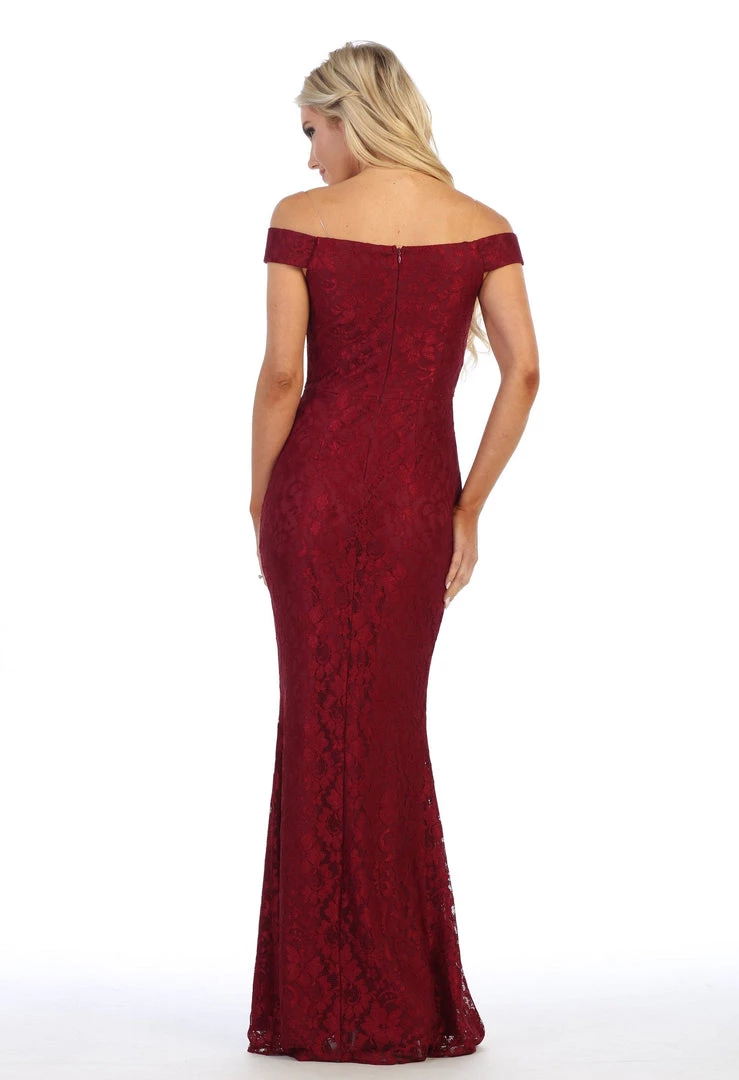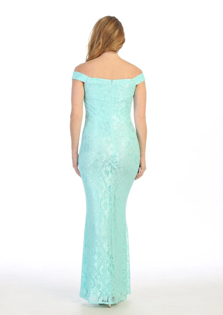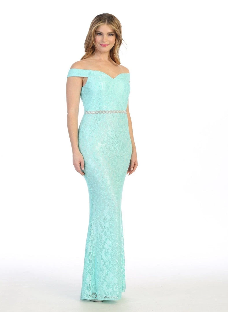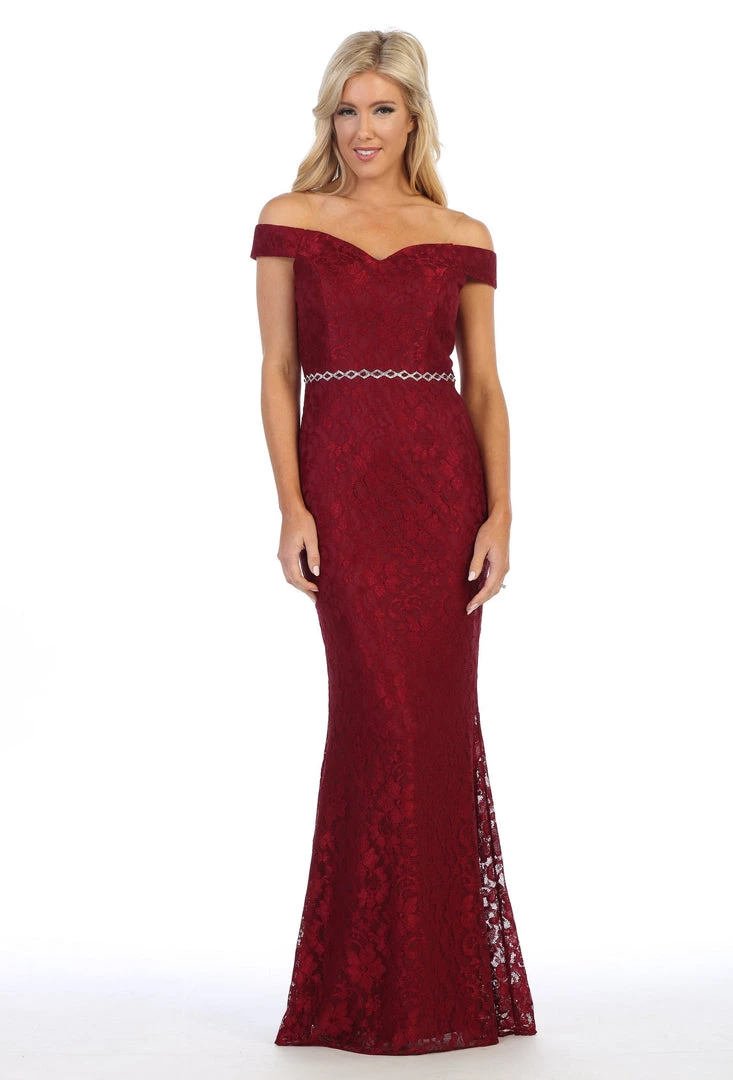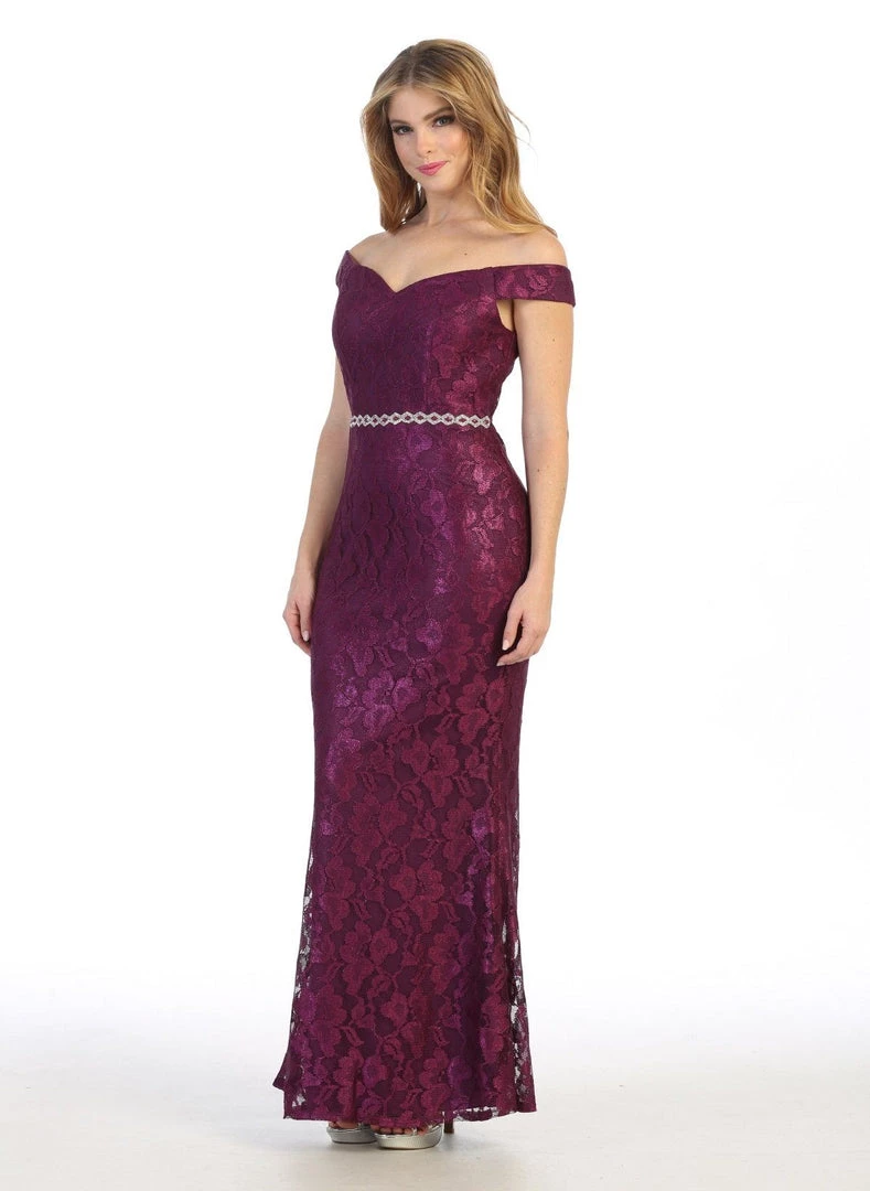 Look picture-perfect in this fitted off the shoulder lace evening dress by Celavie 6409L. This beautiful floral lace formal gown features a semi-sweetheart bodice with off shoulder bodice with mid-length sleeves, rhinestone embellished waistband, floor length mermaid skirt, and a zipper closure. Affordably priced at $139, this long evening dress is perfect for any formal event and will keep you on budget!