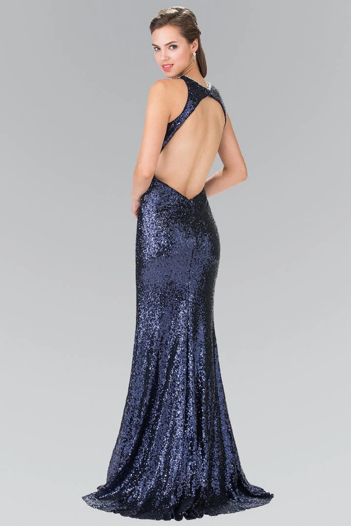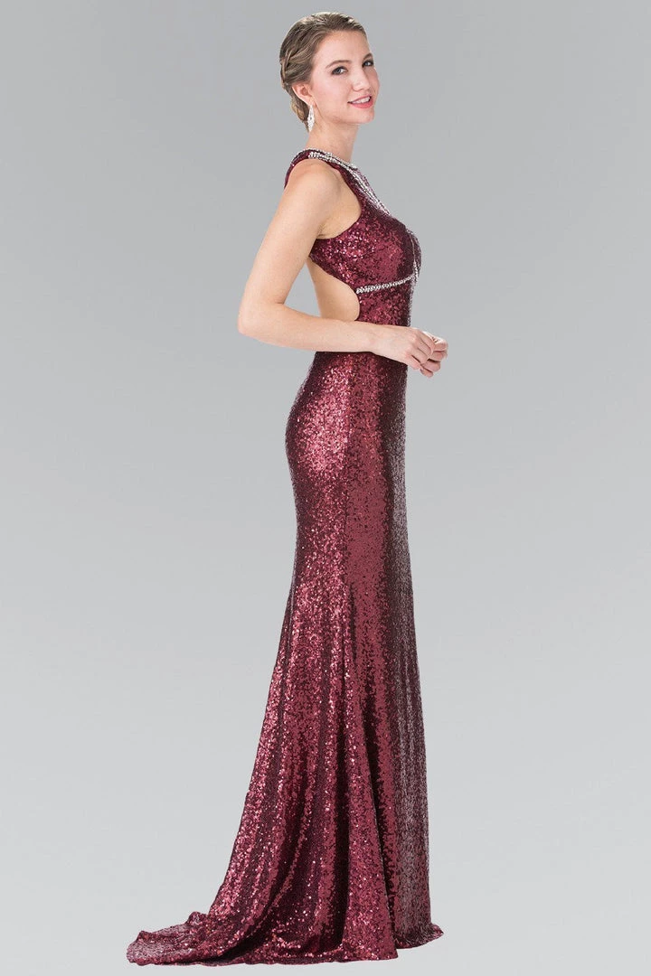 Turn heads in this long open back sequined dress with jeweled accents by Elizabeth K.
