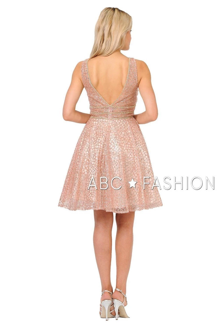 Look breathtaking in this pink sleeveless glitter print cocktail dress by Poly USA 8444. This short party dress features a sleeveless V-neck bodice secured with a sheer inset panel that’s embellished with shimmering trails of glitter all throughout, three gold beaded bands adorn the waist, flirty open V-back, a short A-line skirt, and a zipper closure. Affordably priced under $150, this dress is perfect for any semi-formal event and will keep you on budget!