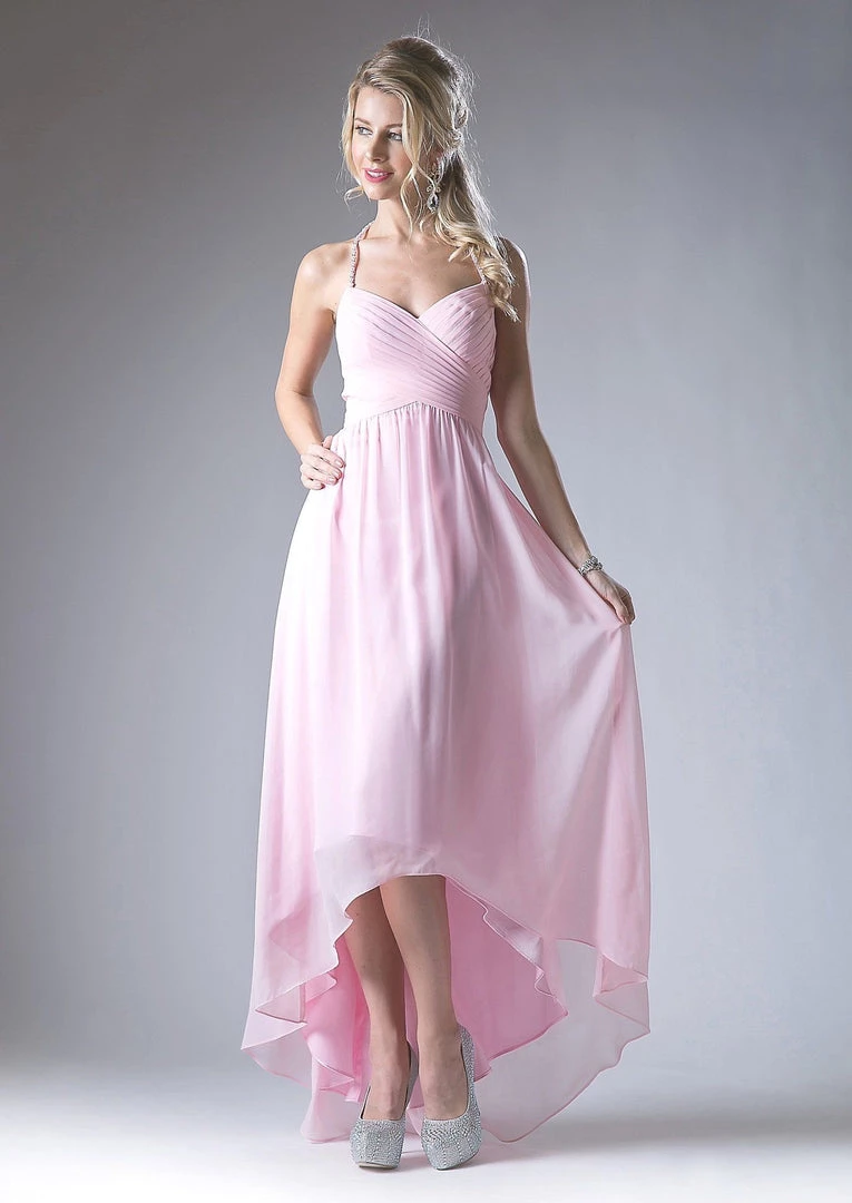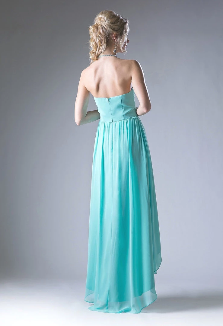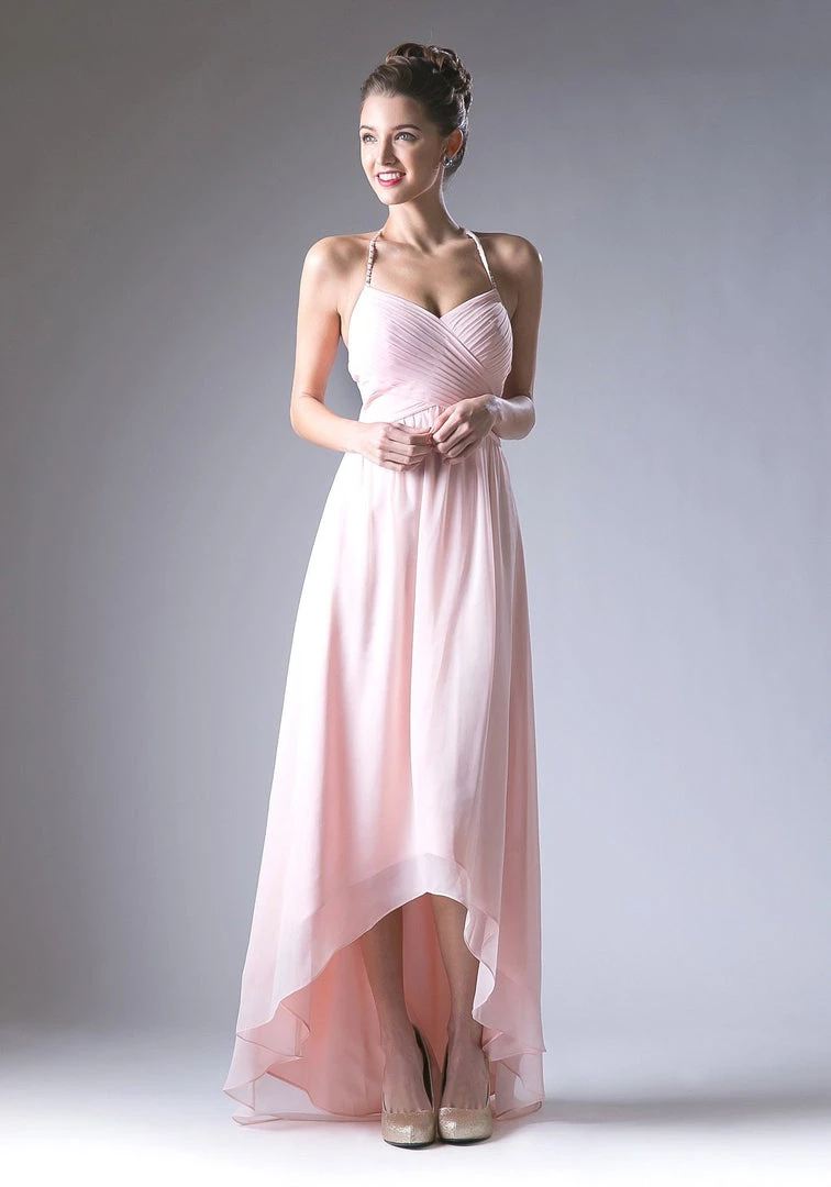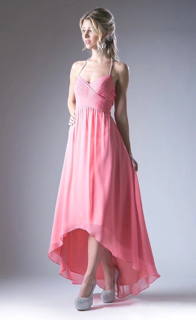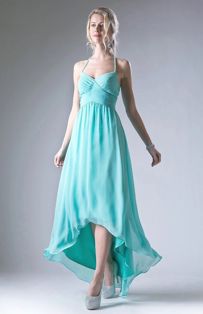 Look timeless in this long halter high low dress with A-line skirt by Cinderella Divine CH528.