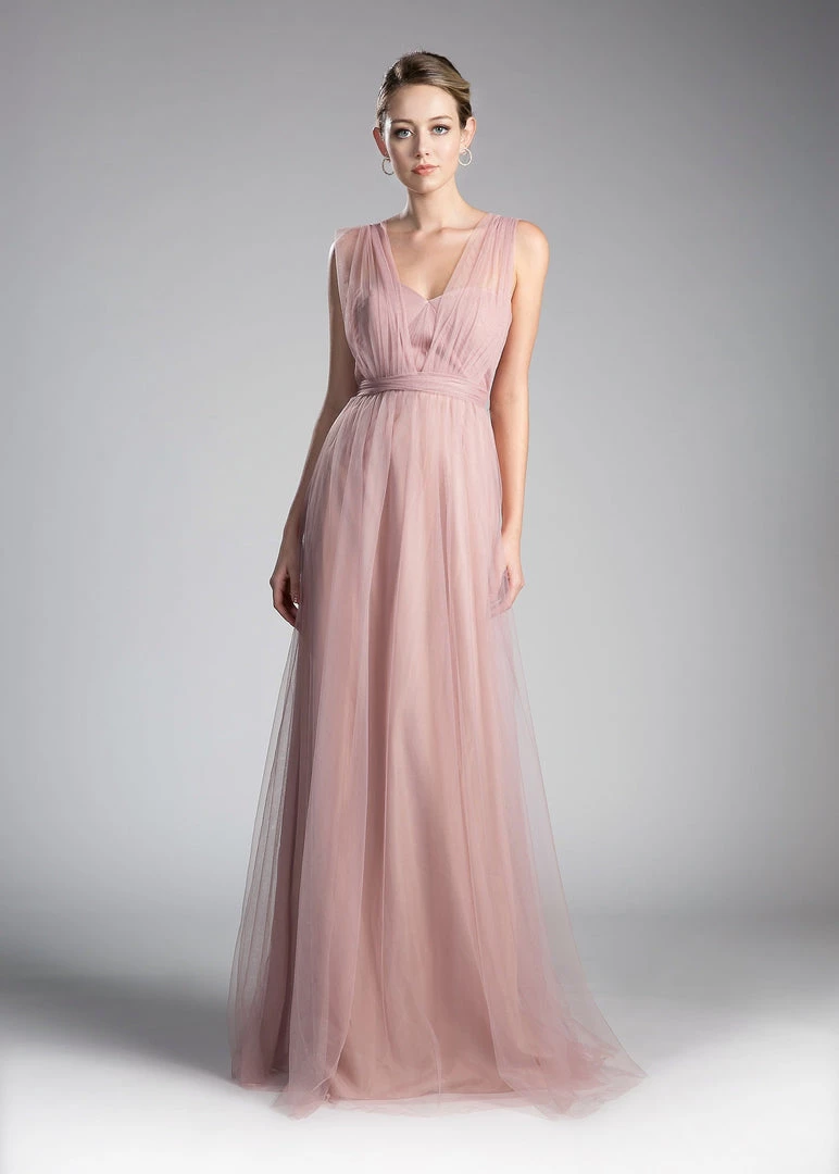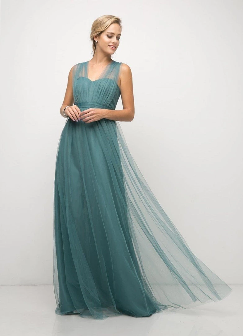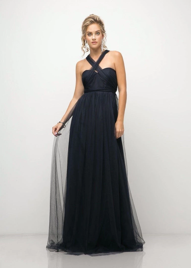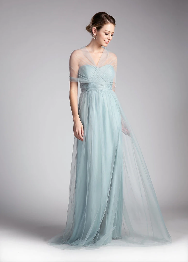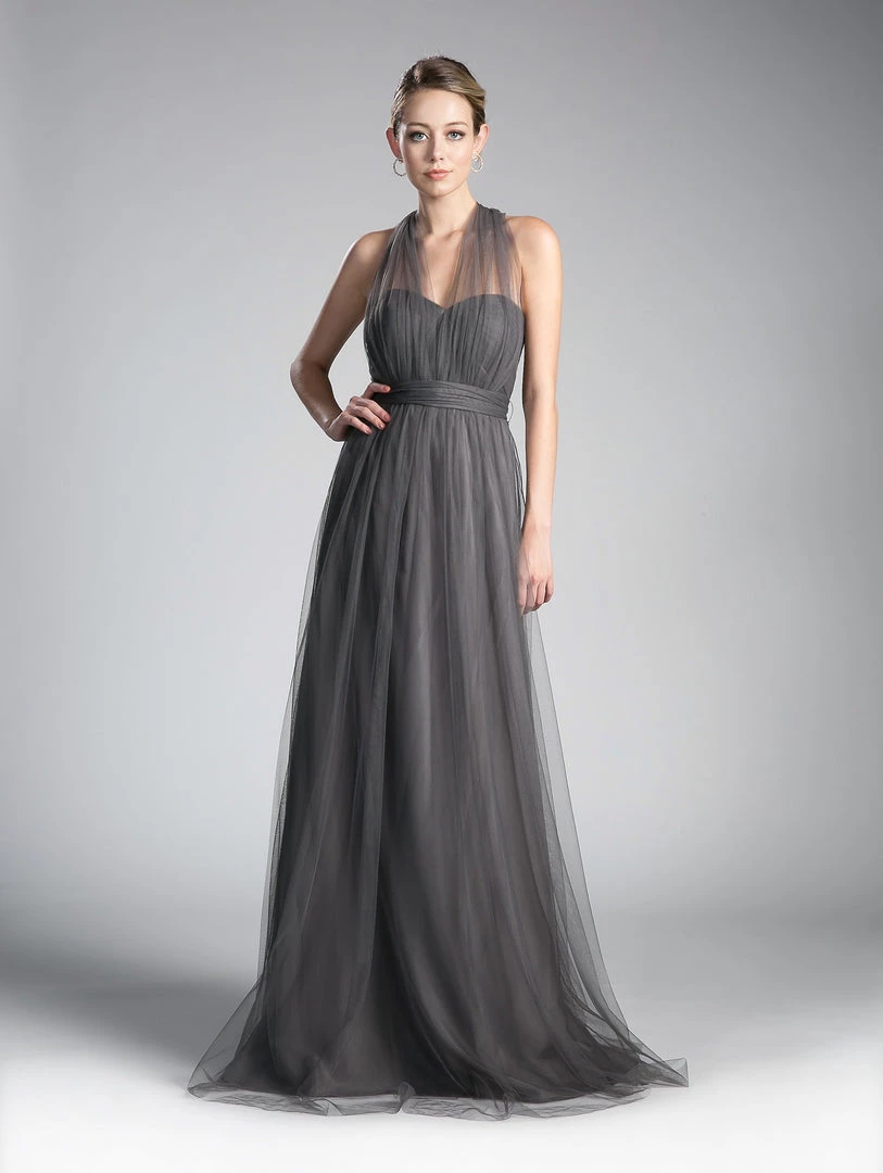 Create lasting memories in this pleated long convertible tulle dress by Cinderella Divine ET322. This gown has long panels that come from the waistline and can be artfully wrapped and tied over the bodice to create several different looks.