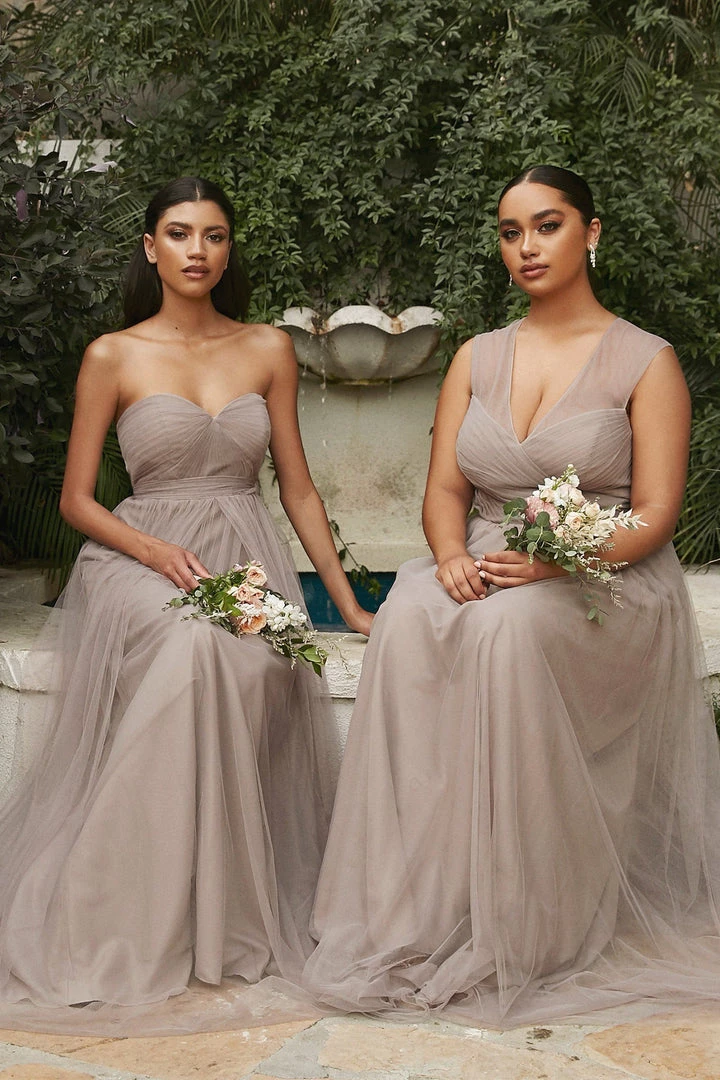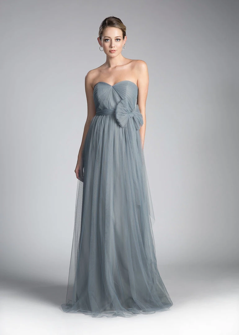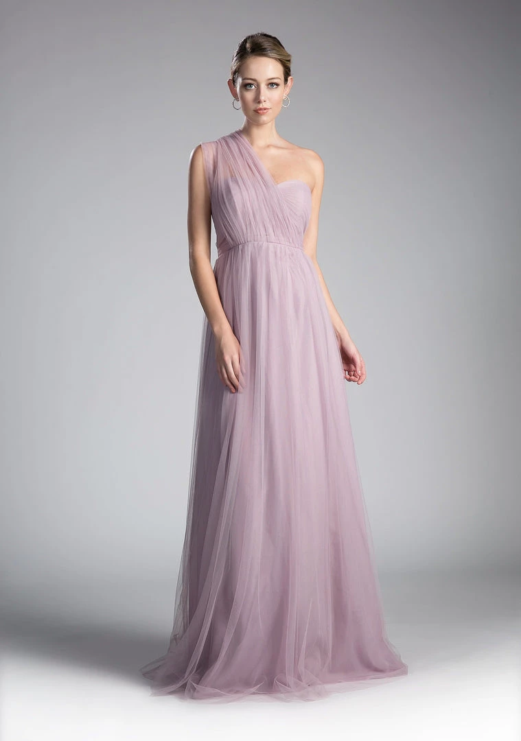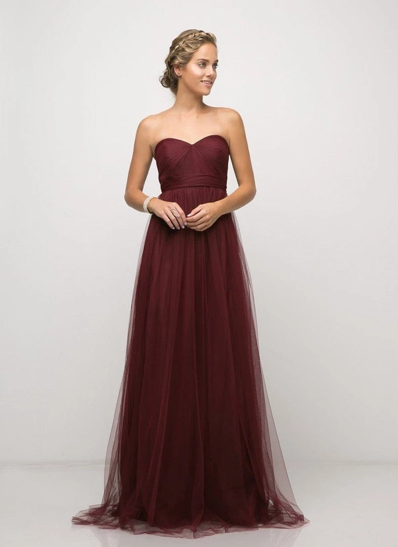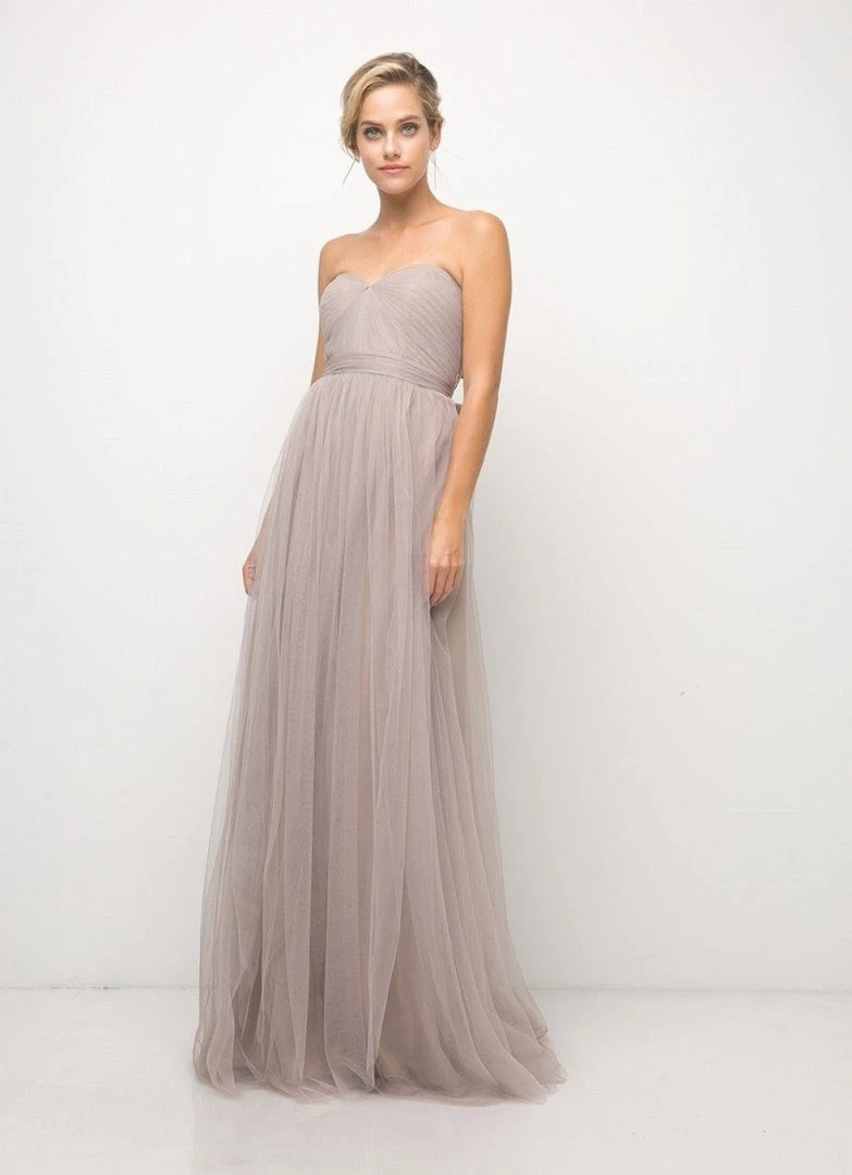 Create lasting memories in this pleated long convertible tulle dress by Cinderella Divine ET322. This gown has long panels that come from the waistline and can be artfully wrapped and tied over the bodice to create several different looks.