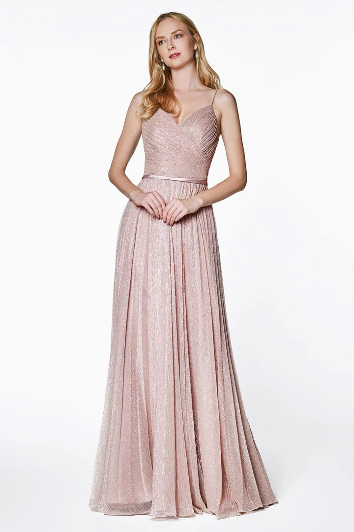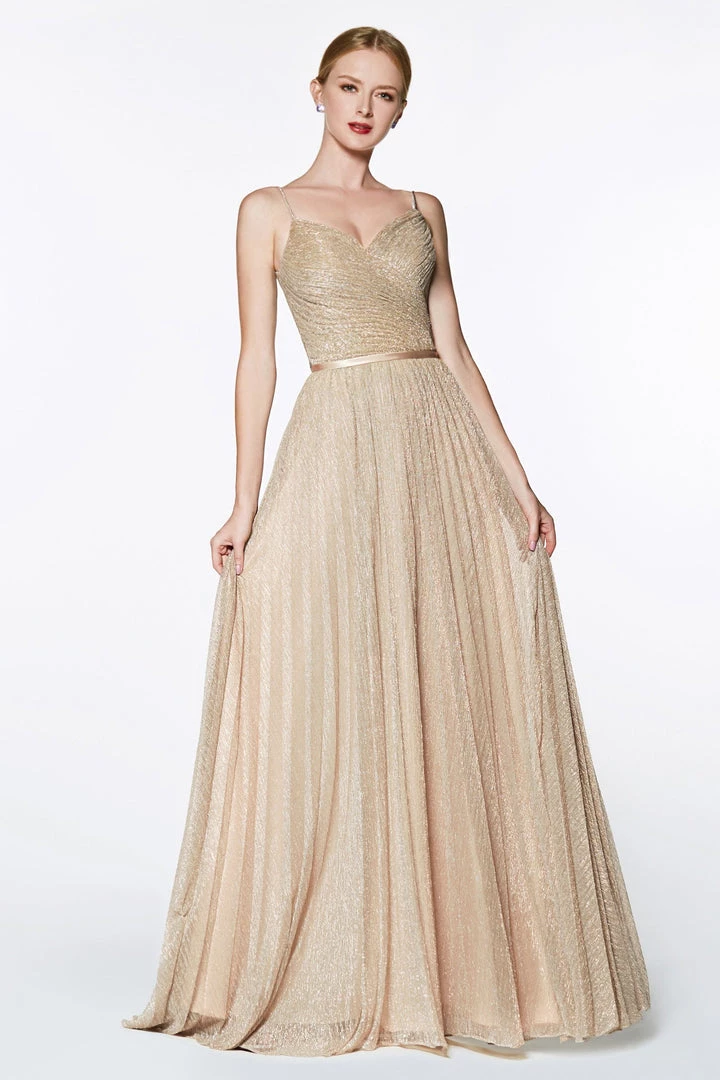 Light up the room in this long sleeveless metallic dress with pleated bodice by Cinderella Divine CJ269. We love this metallic stretch knit flowy A-line dress with pleated details and satin belt!