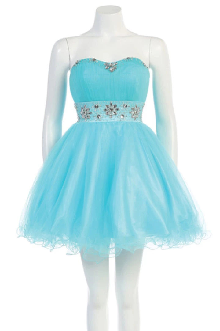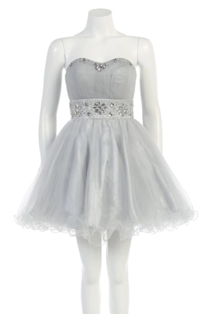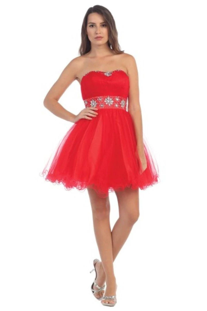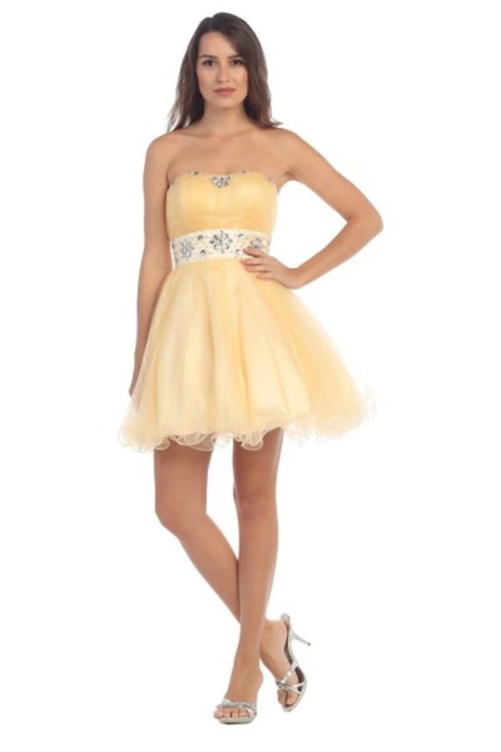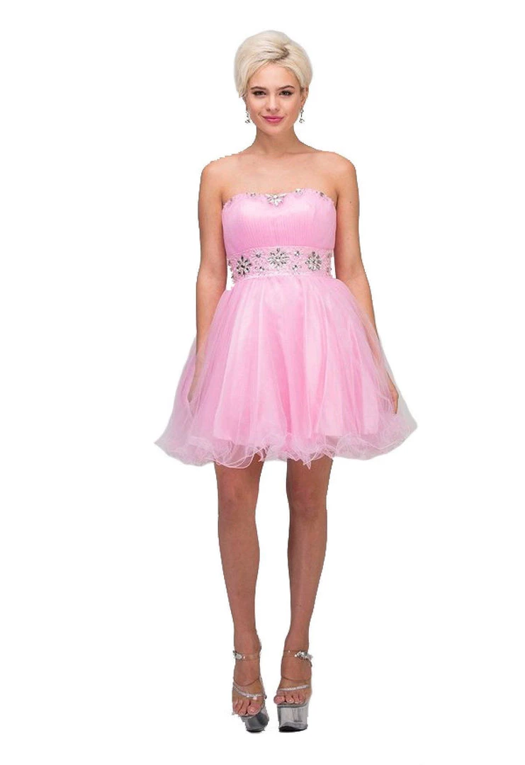 Look unforgettable in this beaded strapless cocktail dress with corset back by Star Box 6006-2. This beautiful short dress features a pleated straight across strapless bodice embellished with sparkly rhinestones, poofy short ruffled skirt with a curly hemline, and a lace-up corset back with zipper closure. Affordably priced at $120, this short party dress is perfect for any formal event and will keep you on budget!