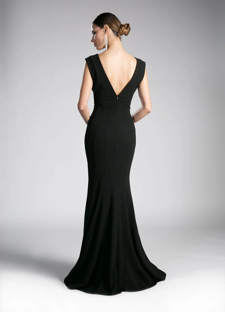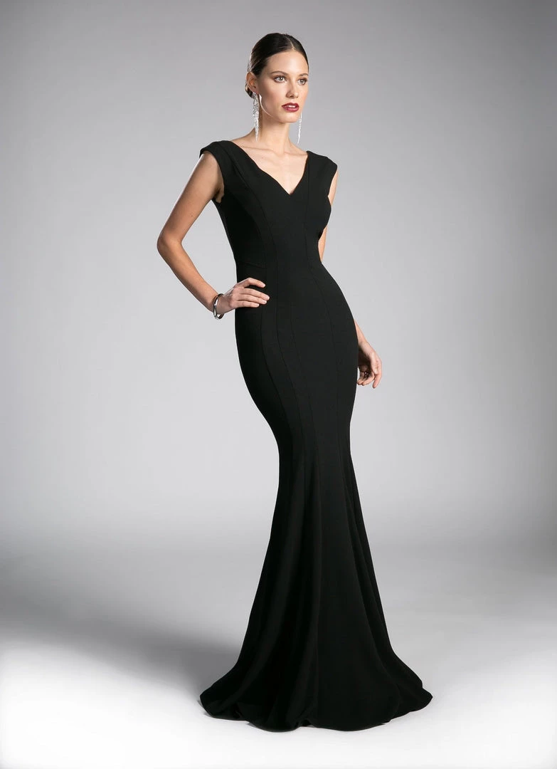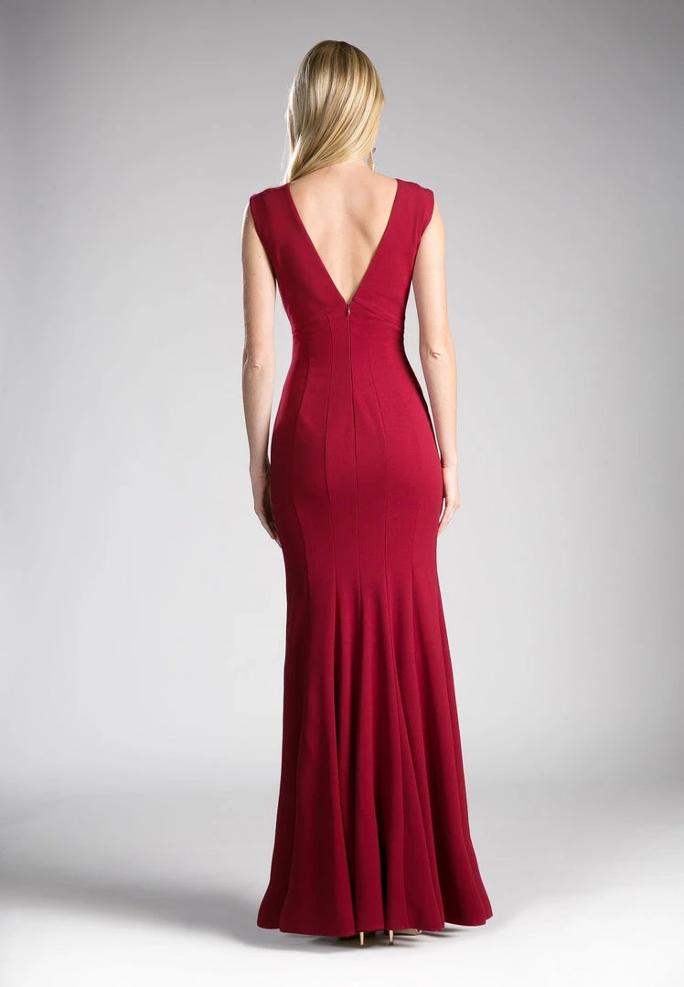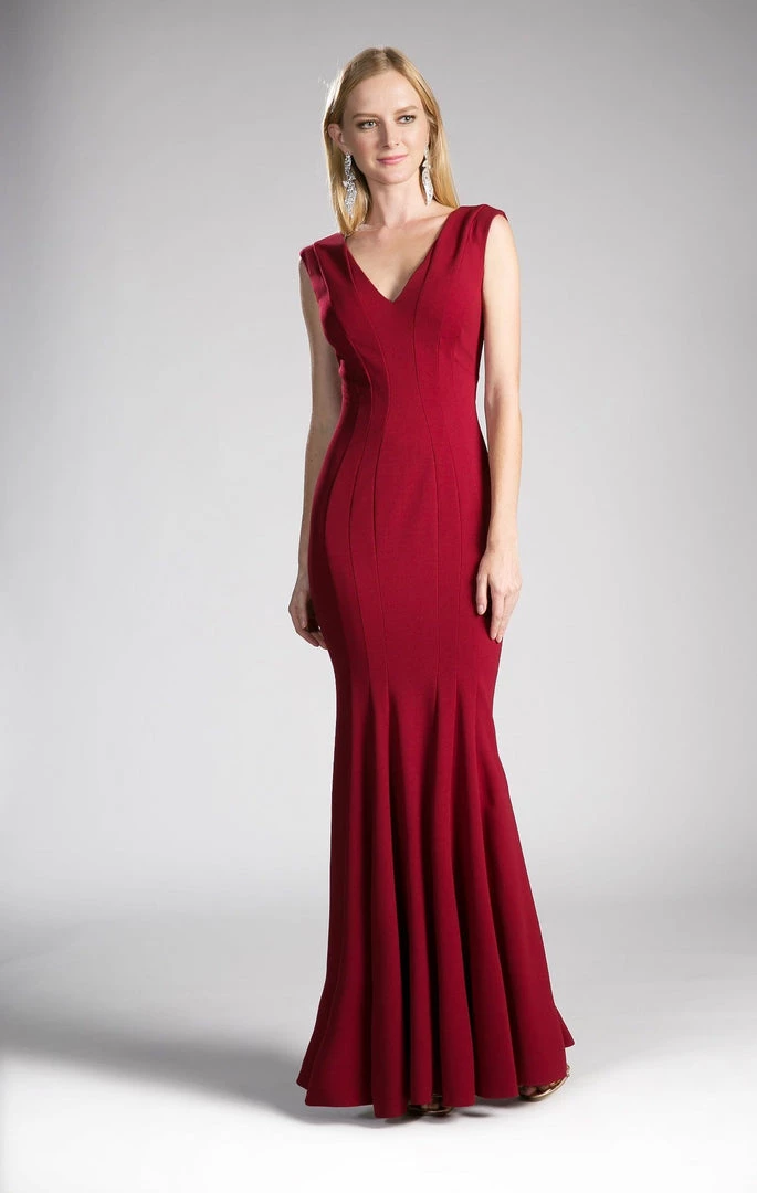 Be stunning in this long sleeveless mermaid dress by Cinderella Divine CD710. This evening gown features a beautiful sleeveless bodice with a V-neckline, beautiful pleats add dimension, a floor length mermaid skirt designed with a small train, and a zipper closure.