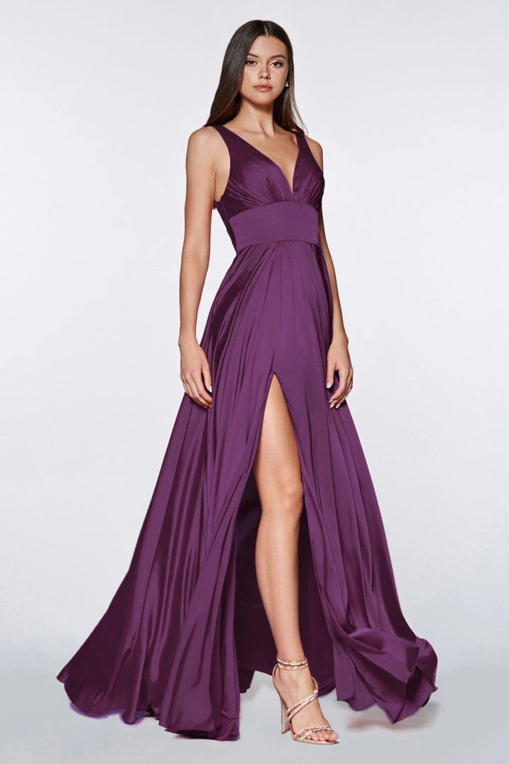 Receive lots of compliments in this long sleeveless V-neck dress with leg slit by Cinderella Divine 7469. We love this satin flowy A-line dress with leg slit, open back and V-neckline!