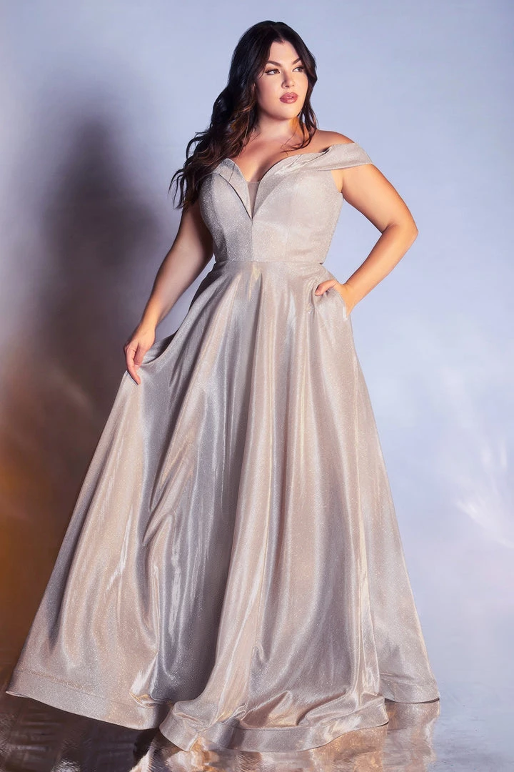 You’ll love twirling around in this plus size long off the shoulder metallic glitter dress with corset back by Cinderella Divine CD210C (Curve Collection).