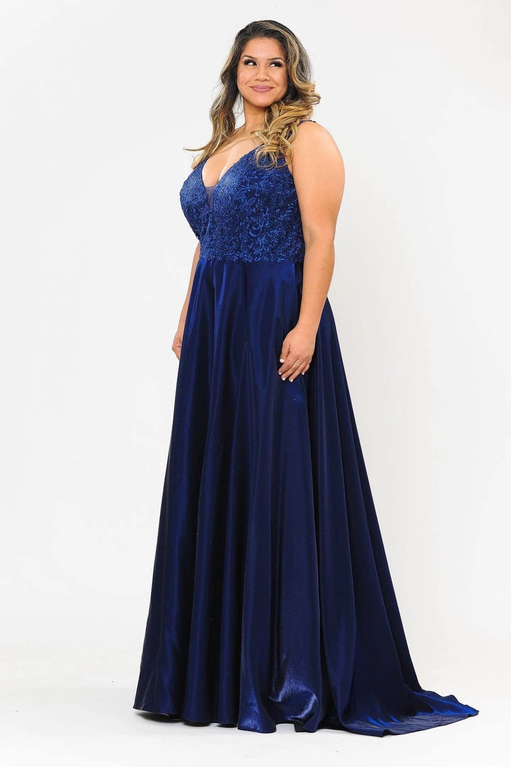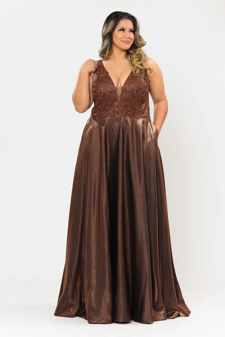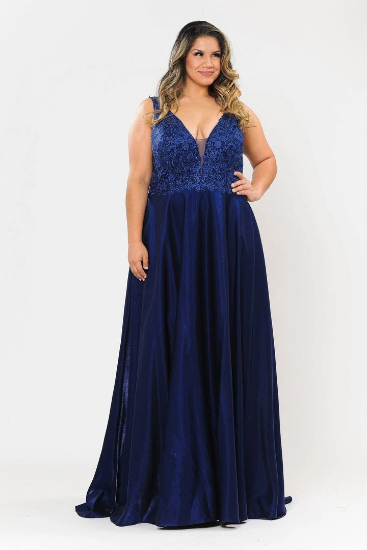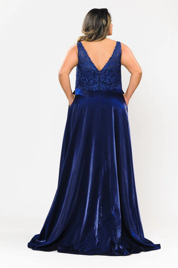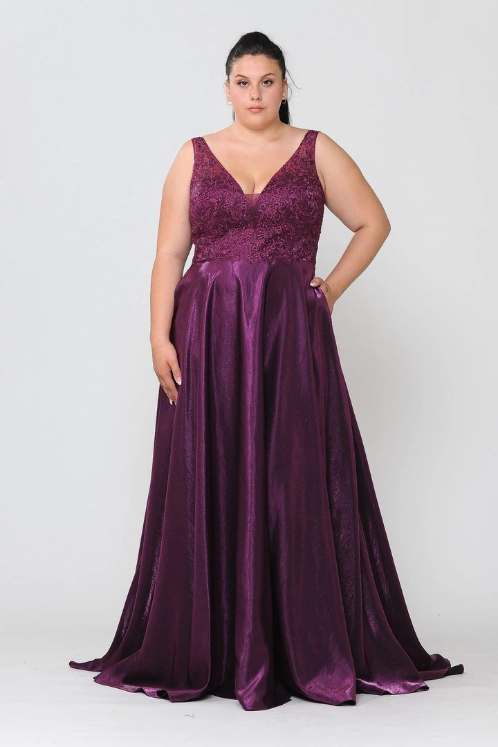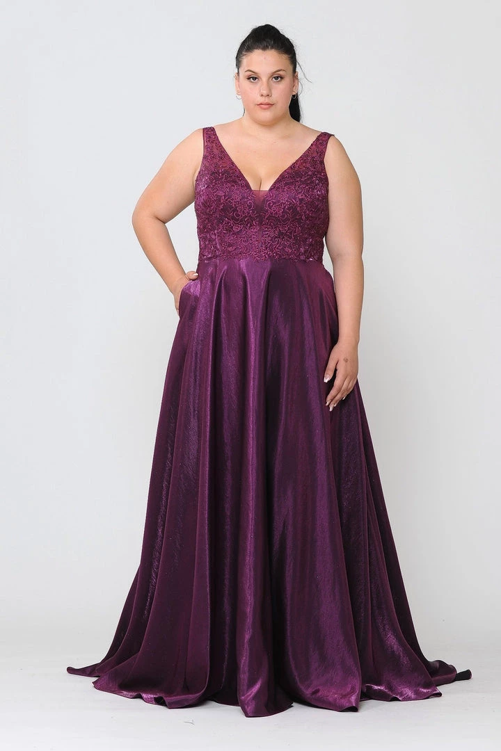 Dance the night away in this plus size long embroidered bodice dress with shimmer satin skirt by Poly USA W1032. Made out of satin, this beautiful gown features a sleeveless V-neck bodice adorned with beaded embroidery, convenient side pockets, open back, floor length A-line skirt with sweep train, and a zipper closure.