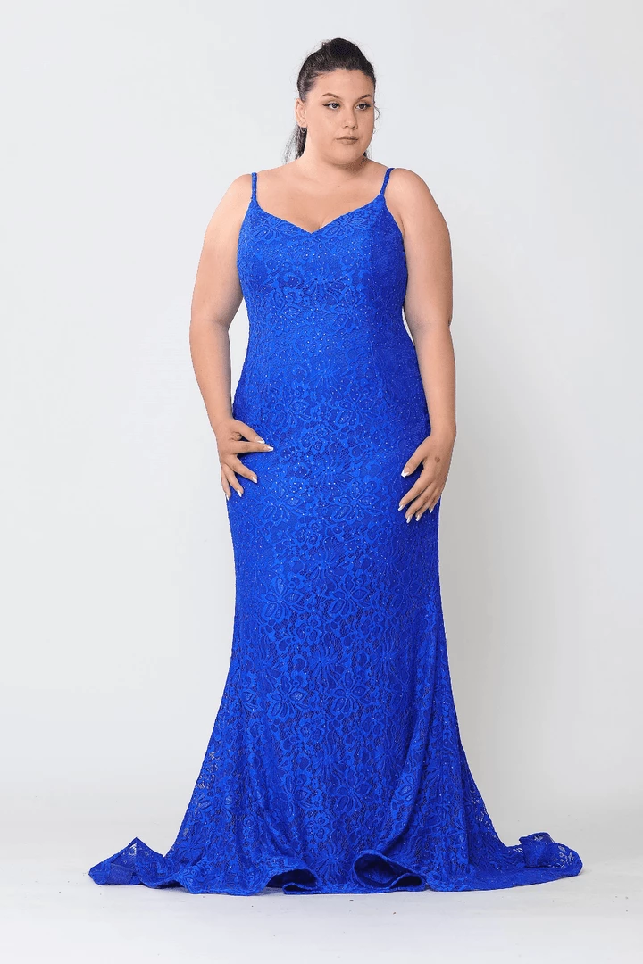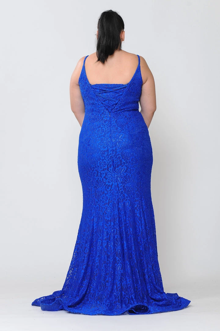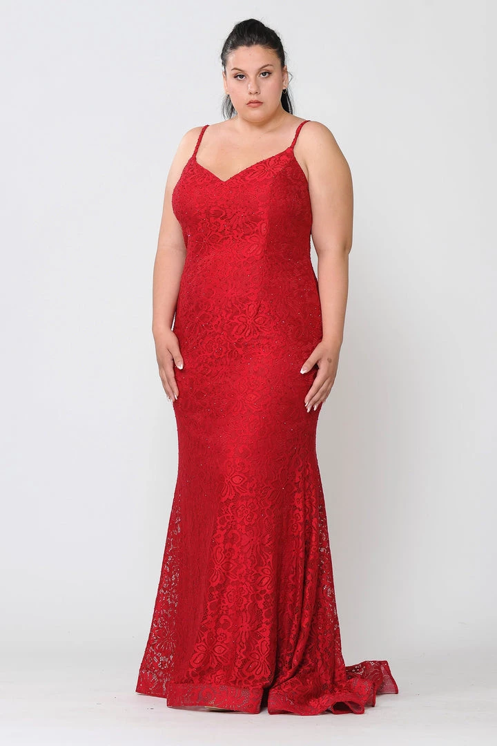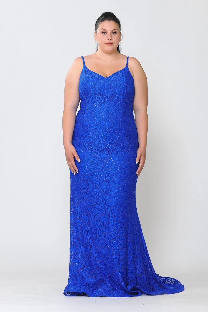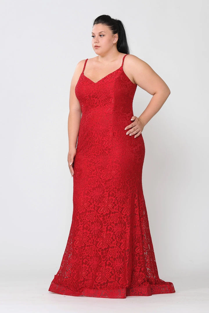 Receive lots of compliments in this plus size long V-neck floral lace dress by Poly USA W1090. This beautiful gown features a sleeveless V-neck bodice, floral lace, open back, fitted floor length skirt with sweep train, and a lace-up corset back.