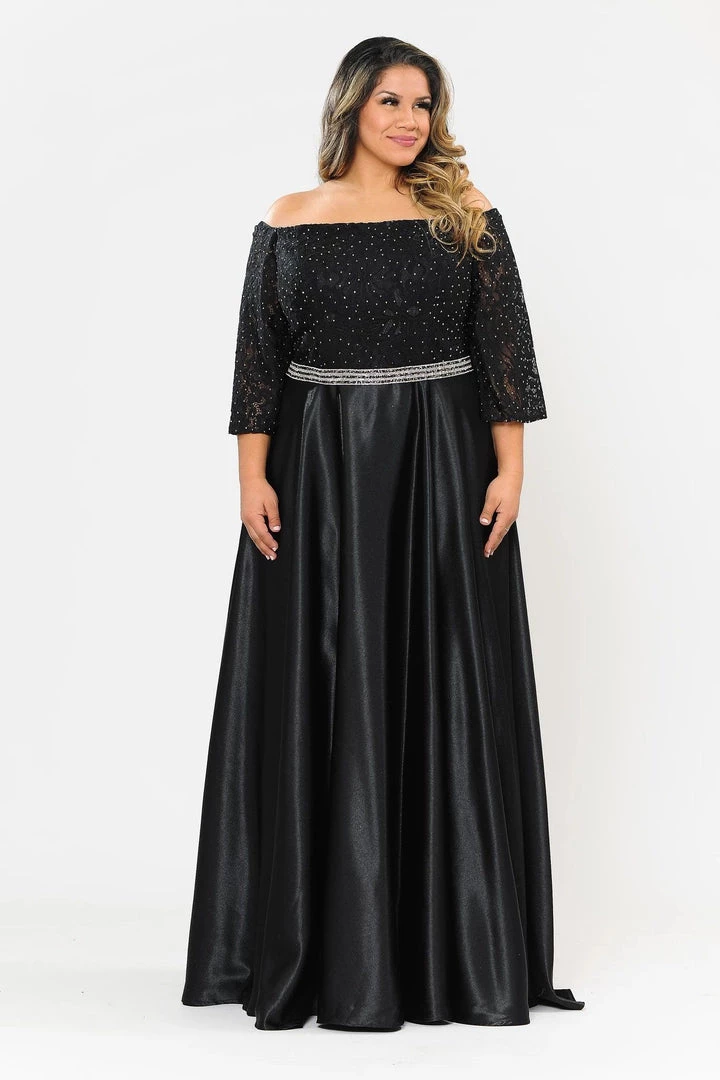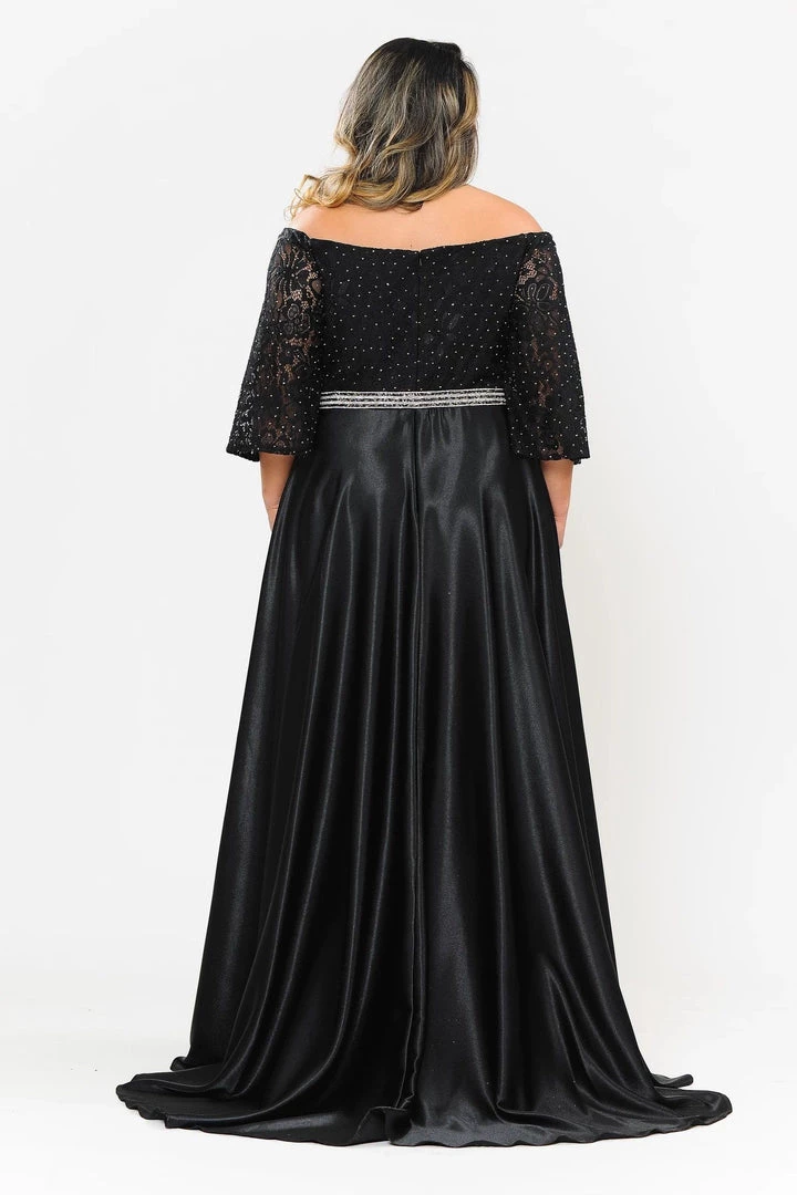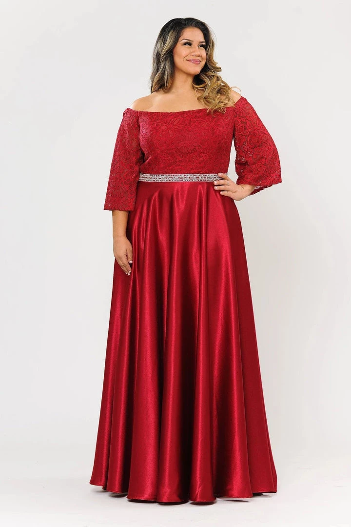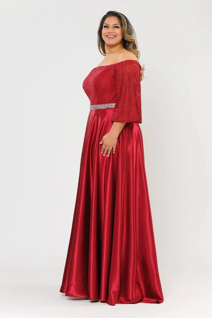 Look modest chic in this plus size long off the shoulder dress with lace bell sleeves by Poly USA W1008. This beautiful gown features a straight across lace bodice, illusion bell sleeves, removable bead embellished waistband, convenient side pockets, open back, floor length A-line crepe satin skirt with sweep train, and a lace-up corset back.