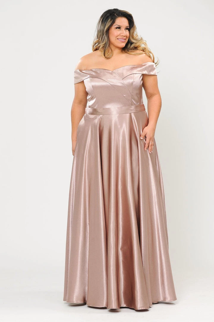 All eyes will be on you in thisĀ plus size long off the shoulder satin dress by Poly USA W1058. Made out of crepe satin, this beautiful gown features an off shoulder bodice with a wide V-neckline, cap sleeves, convenient side pockets, open back, floor length A-line crepe satin skirt, and a zipper back.