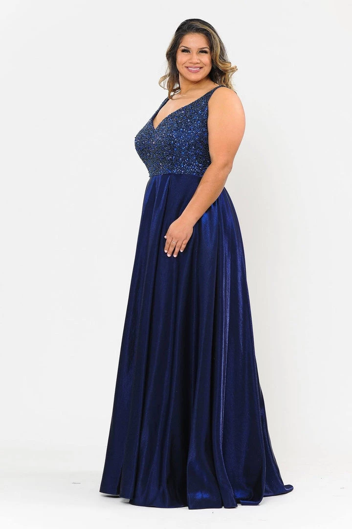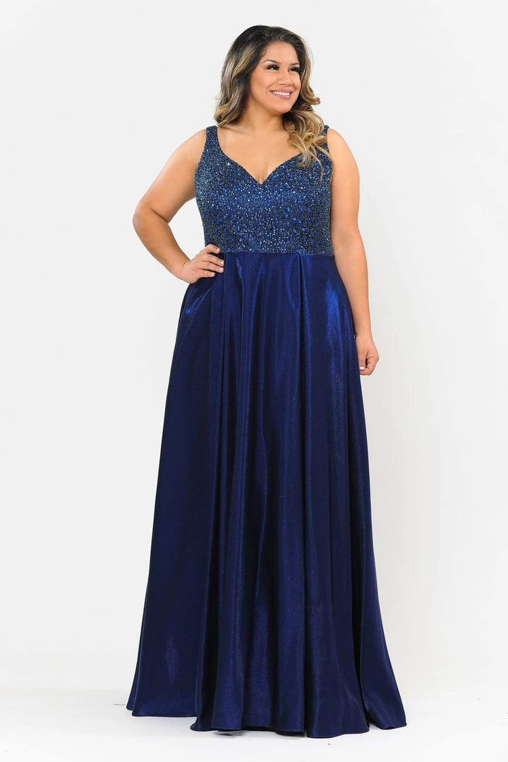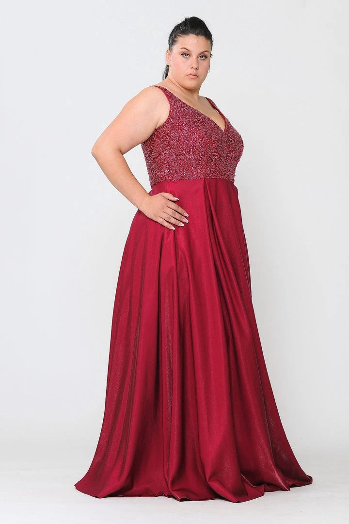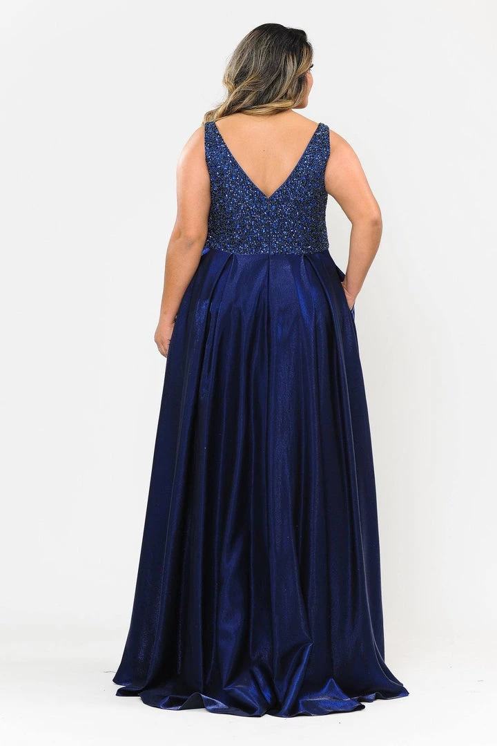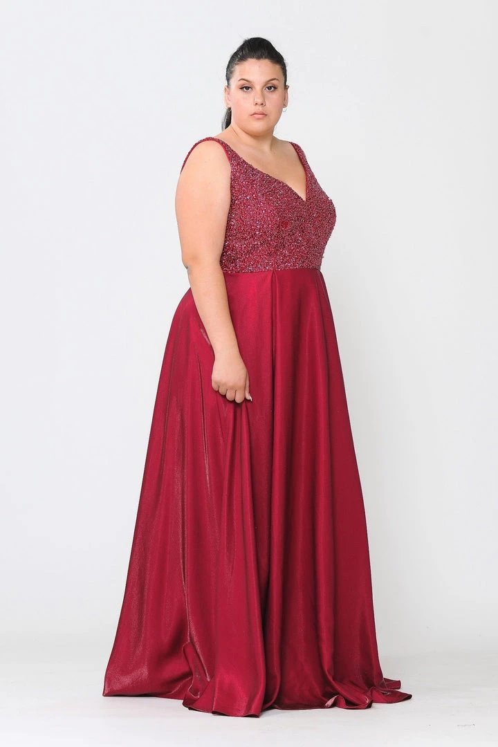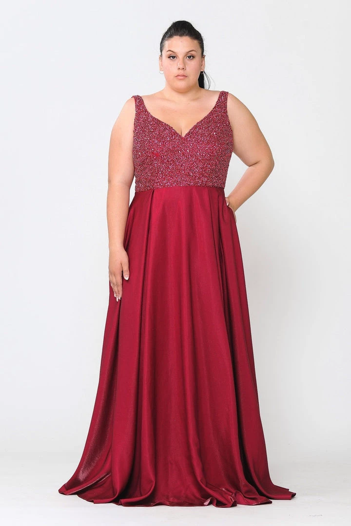 Look radiant in thisĀ plus size long A-line satin dress with beaded V-neck bodice by Poly USA W1066. This beautiful gown features a sleeveless tank bodice adorned with sparkly rhinestones, detachable bead embellished waistband, convenient side pockets, open back, floor length A-line skirt with sweep train, and a lace-up corset back.