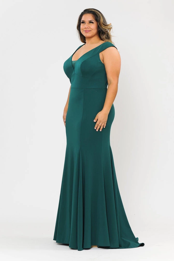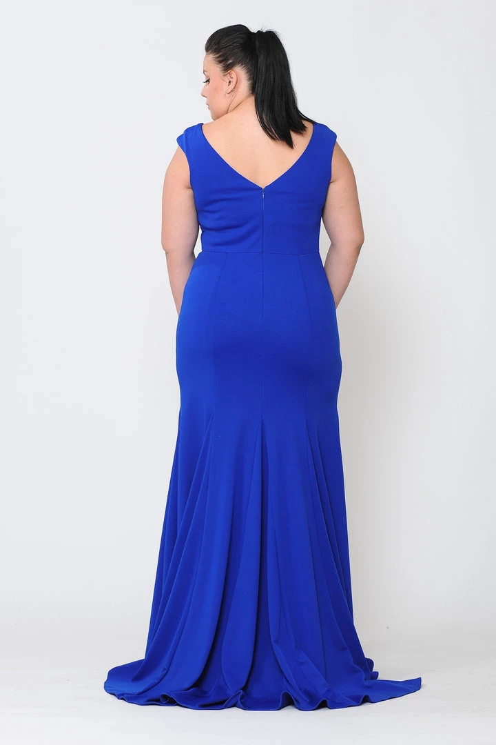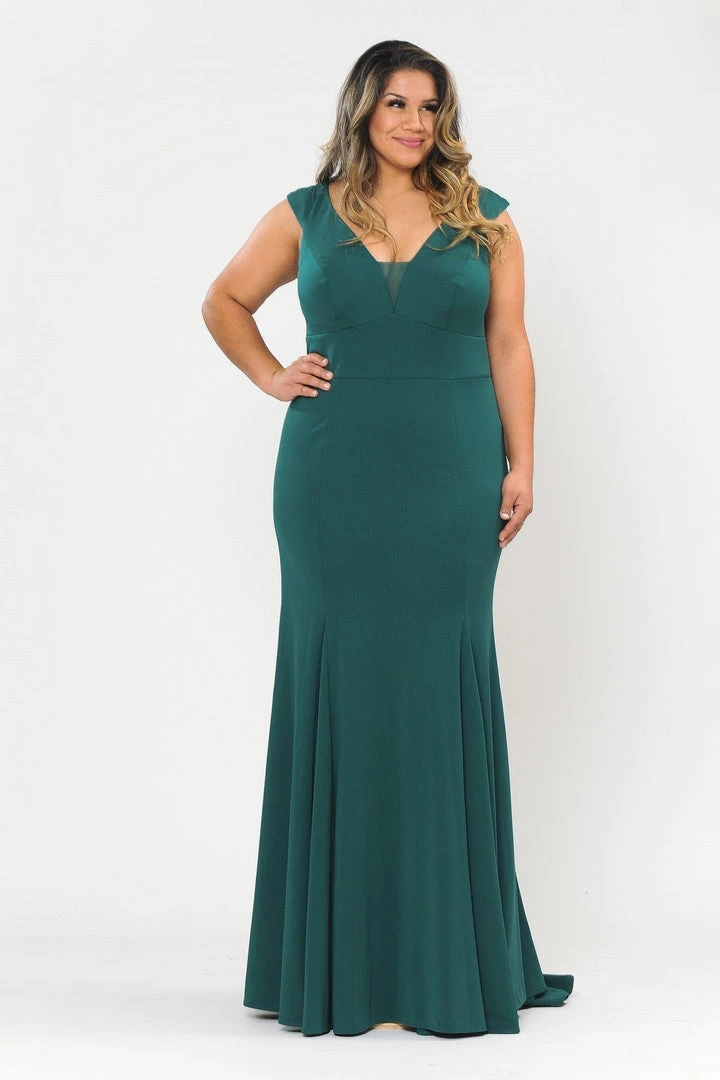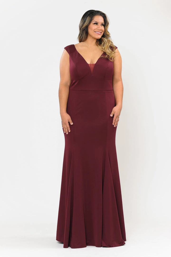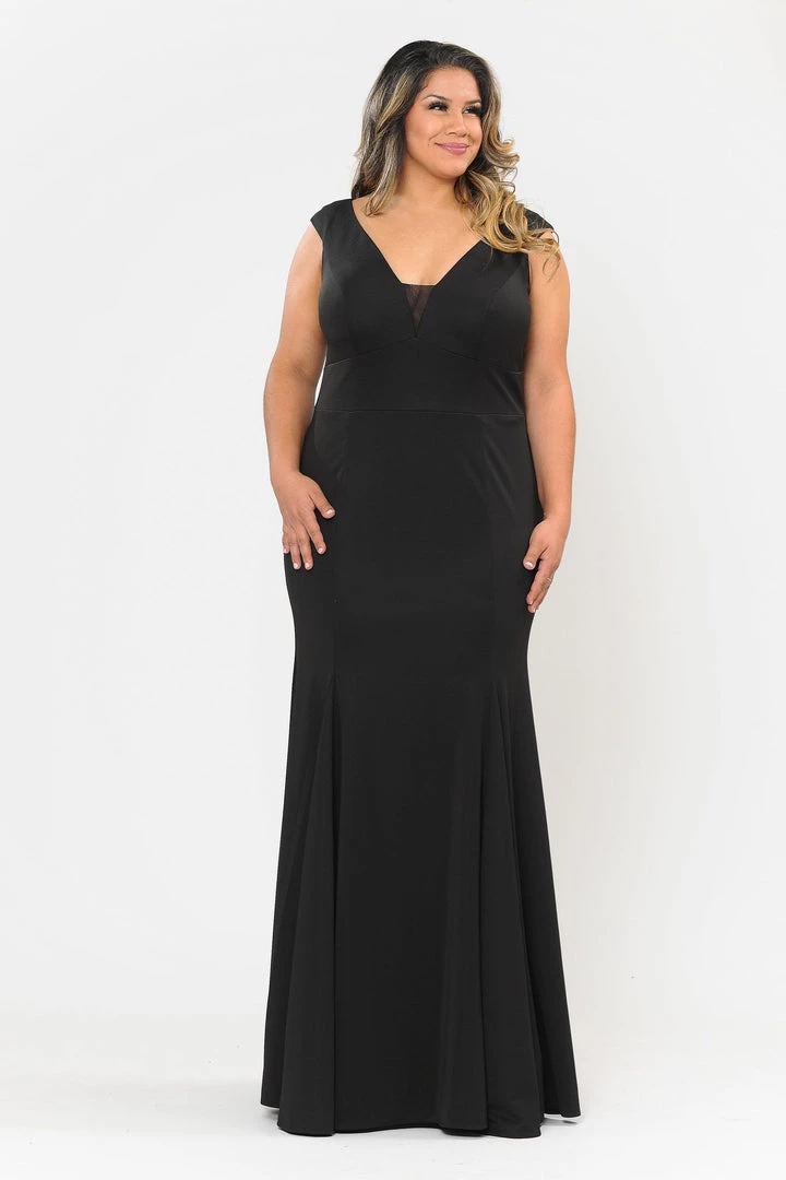 Be selfie ready in this plus size long jersey mermaid dress by Poly USA W1022. This beautiful gown features a sleeveless illusion V-neck bodice, modest open V-back, fitted floor length skirt with sweep train, and a zipper back.