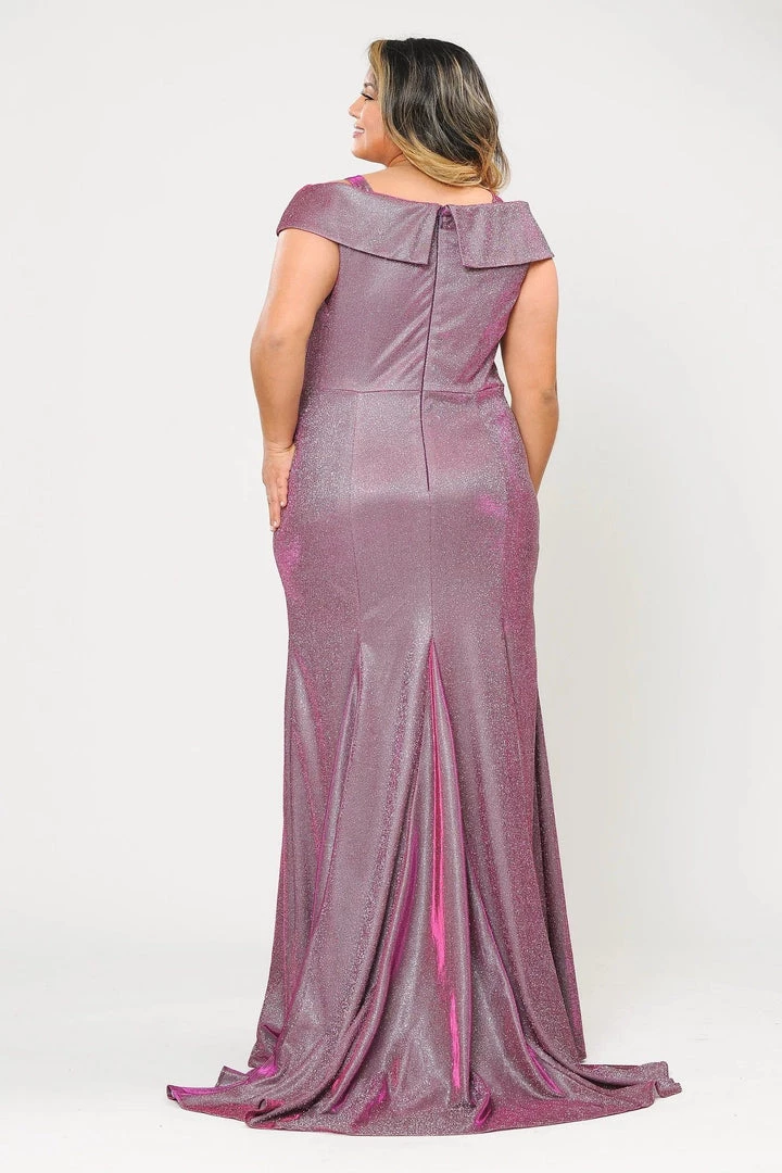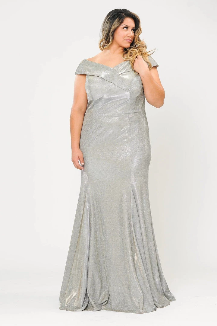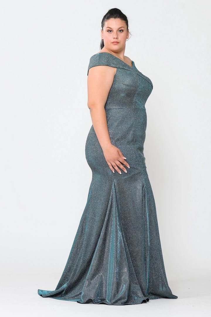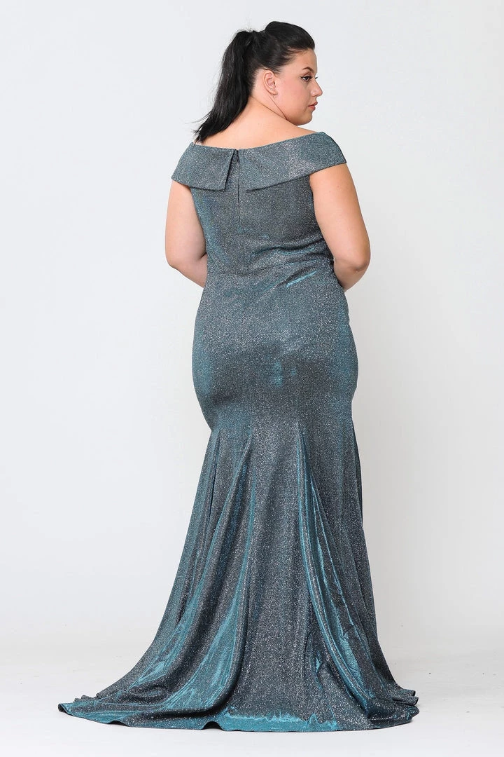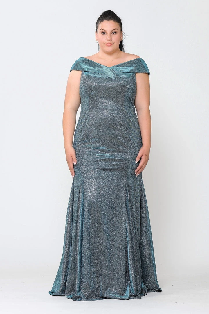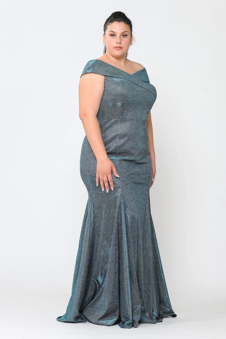 Receive lots of compliments in thisĀ plus size long metallic glitter off the shoulder fitted dress by Poly USA W1042. Made out of glitter knit, this beautiful gown features an off shoulder bodice with a wide V-neckline, detachable cold shoulder straps, enclosed back, floor length trumpet skirt with sweep train, and a zipper closure.