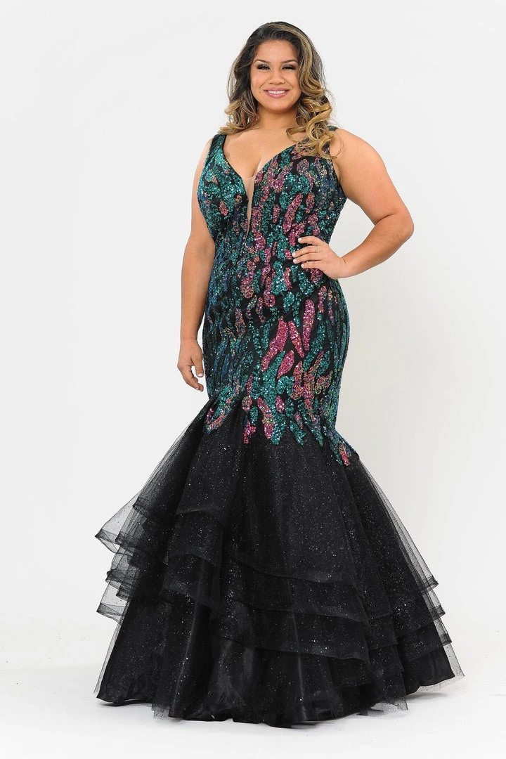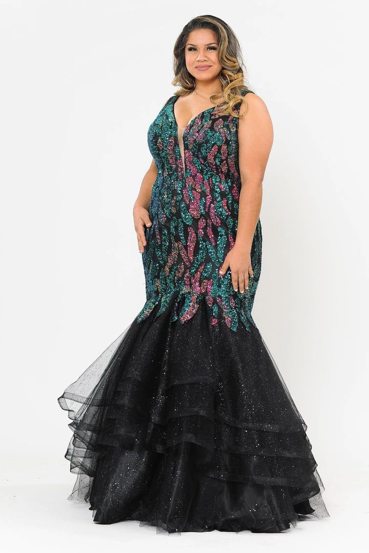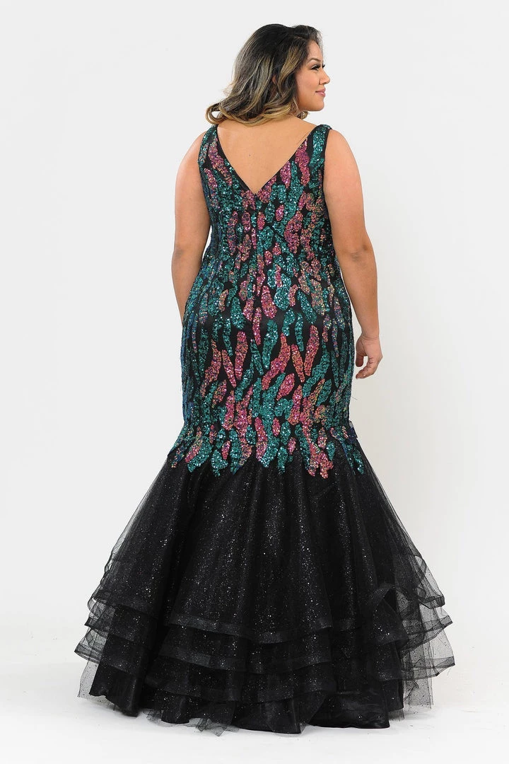 Be selfie ready in this plus size long sequined mermaid dress with tiered glitter skirt by Poly USA W1072. This beautiful gown features a sleeveless illusion V-neck bodice, vibrant sequin embellishments, open V-back, fitted floor length glitter skirt with horsehair hemline, and a zipper back.
