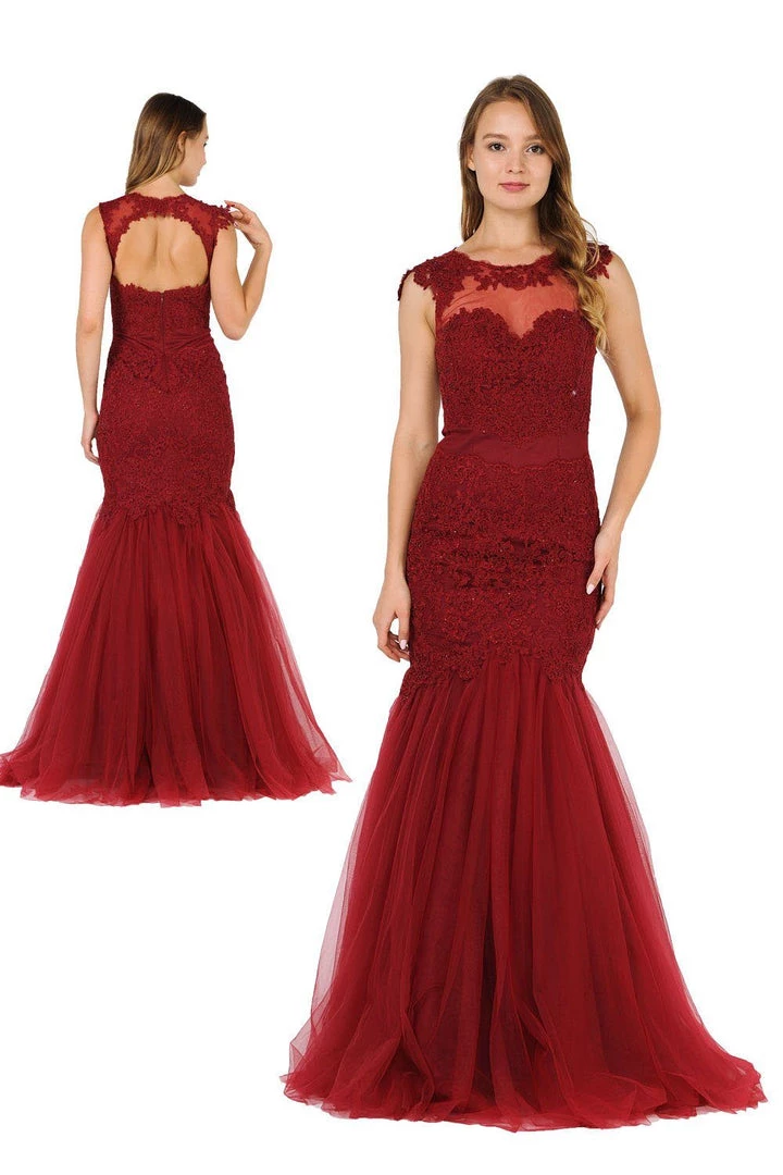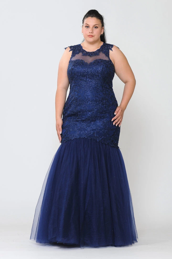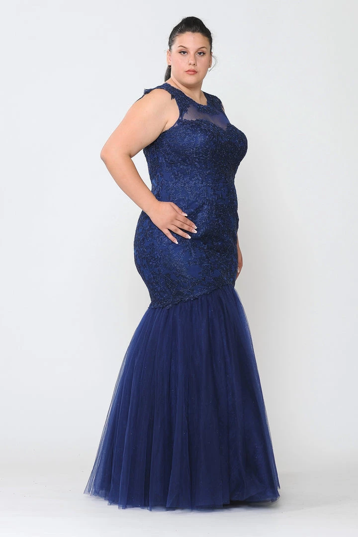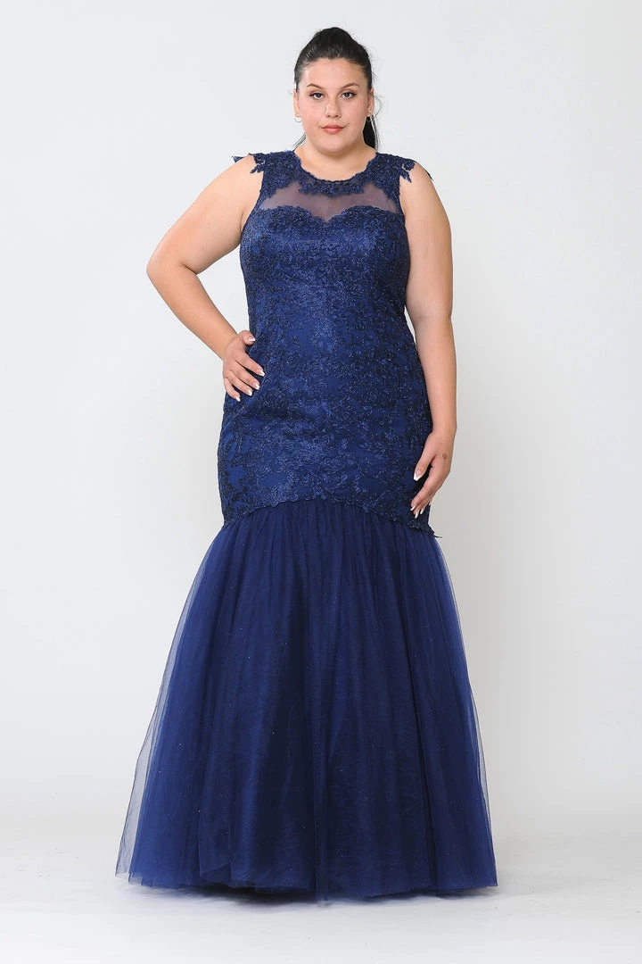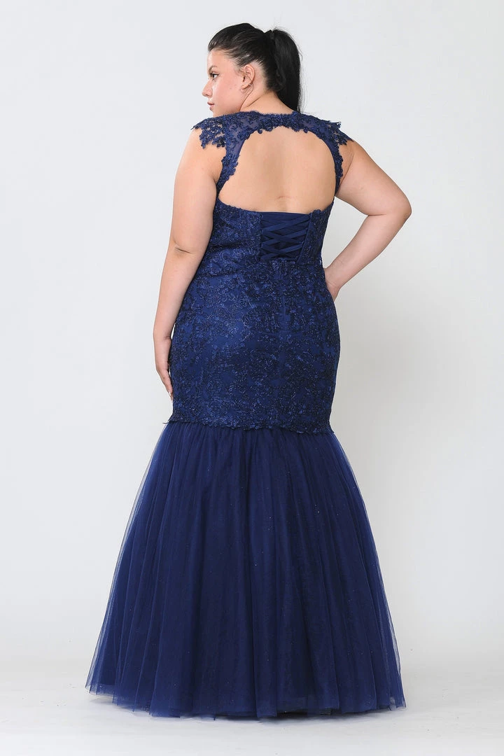 Look picture-perfect in this embroidered plus size mermaid dress by Poly USA W1084. Glamorous mermaid mesh dress embellished with lace appliques and rhinestones. Illusion sweetheart neckline adorned with beautiful lace appliques. Open back with cutout and lace-up corset back.