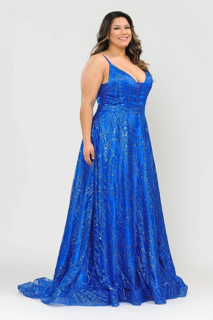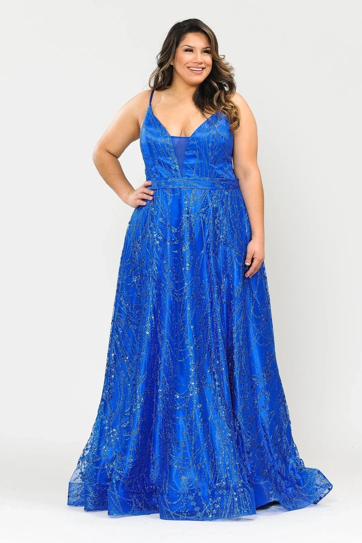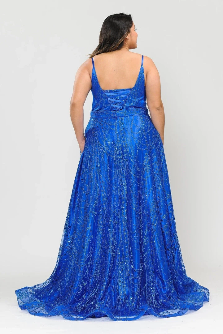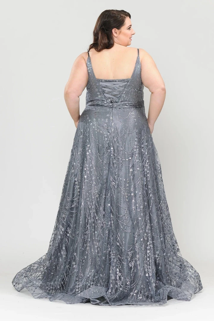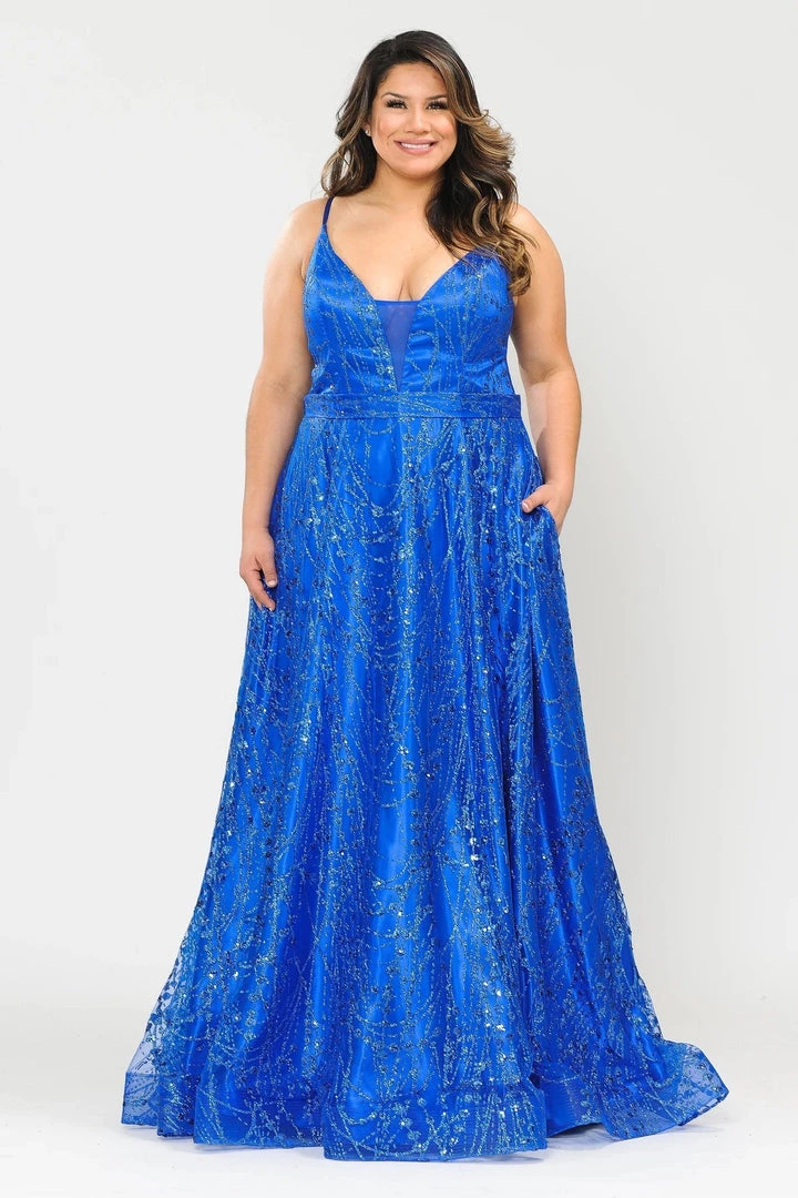 Receive lots of compliments in thisĀ plus size long glitter mesh A-line dress by Poly USA W1004. This beautiful gown features a spaghetti strap sleeveless illusion V-neck bodice, glitter and sequin embellishments, convenient side pockets, open back, floor length A-line skirt with sweep train, and a lace-up corset back.