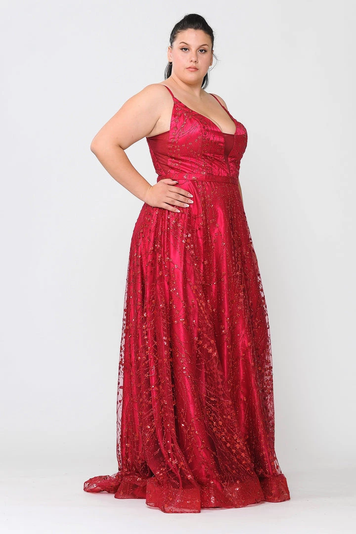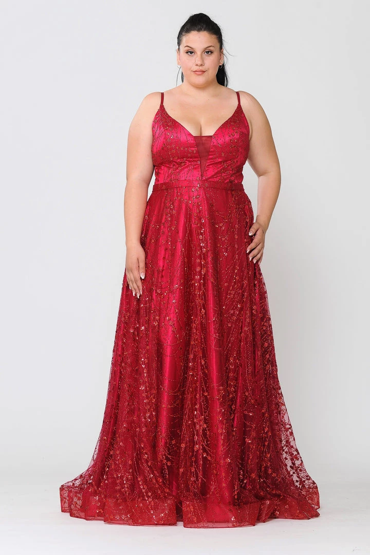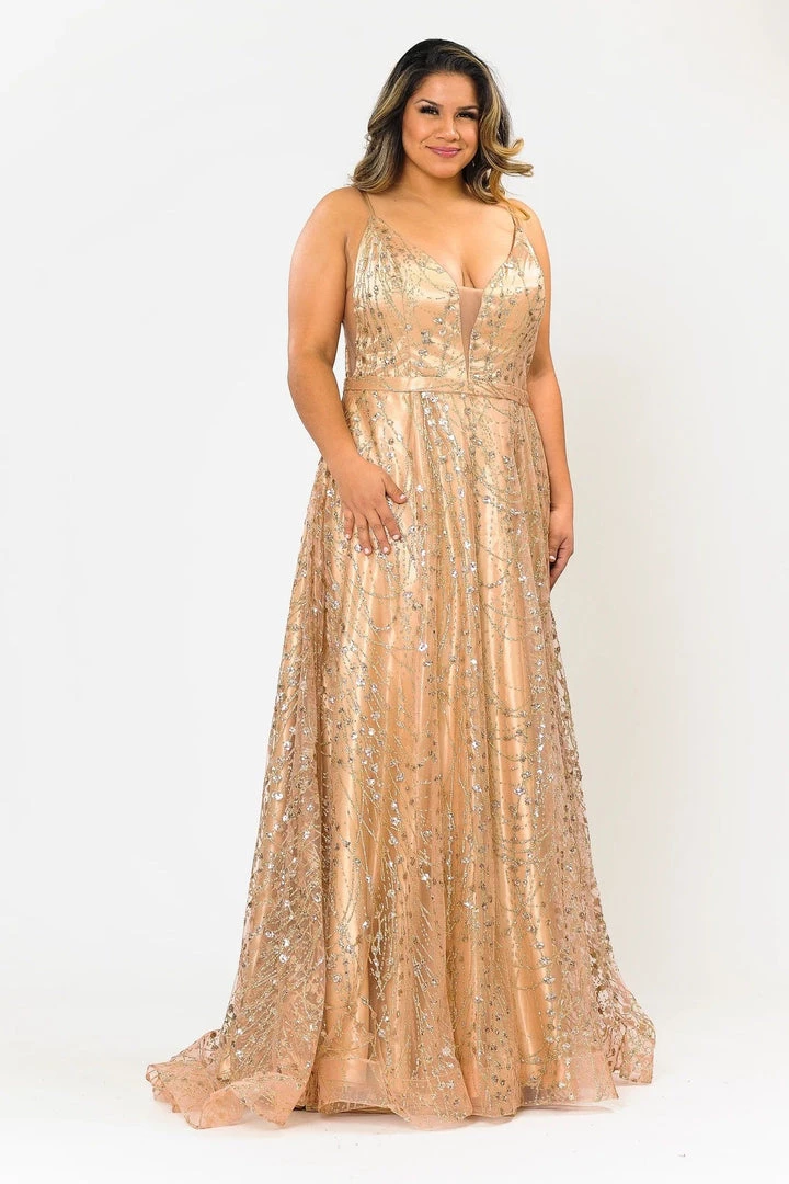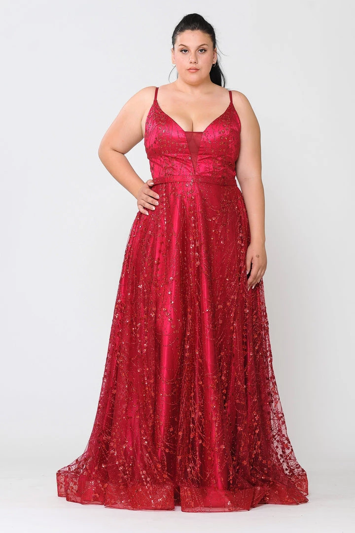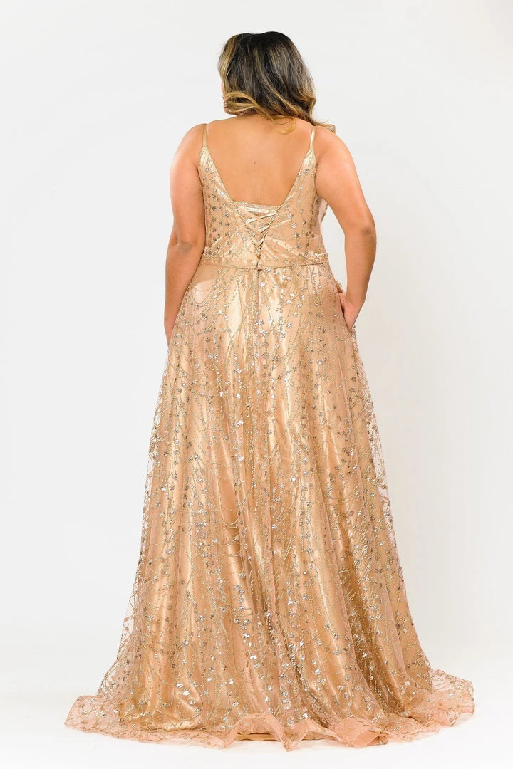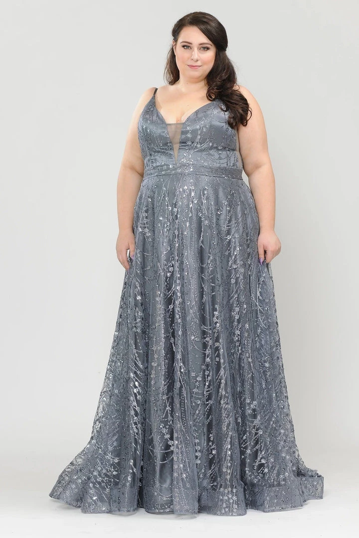 Receive lots of compliments in thisĀ plus size long glitter mesh A-line dress by Poly USA W1004. This beautiful gown features a spaghetti strap sleeveless illusion V-neck bodice, glitter and sequin embellishments, convenient side pockets, open back, floor length A-line skirt with sweep train, and a lace-up corset back.