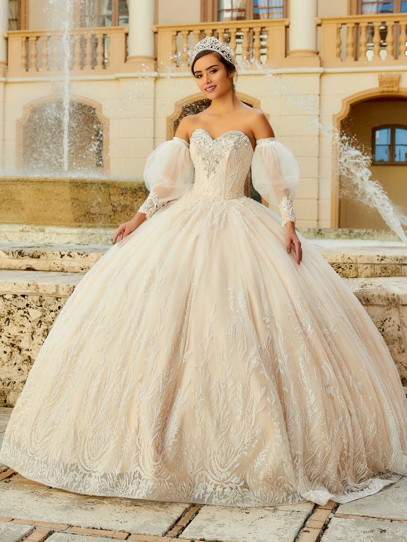 Captivate the room in this embellished long strapless dress with A-line skirt by House of Wu Quinceanera Collection 26981B. Made out of tulle, this beautiful strapless ball gown features a sweetheart bodice adorned with glitter floral appliques and layers tulle gathered ball gown skirt that finished with glitter floral hemline. This look is finished with a lace-up corset back and a sweep train. Detachable pouf sleeves are included.