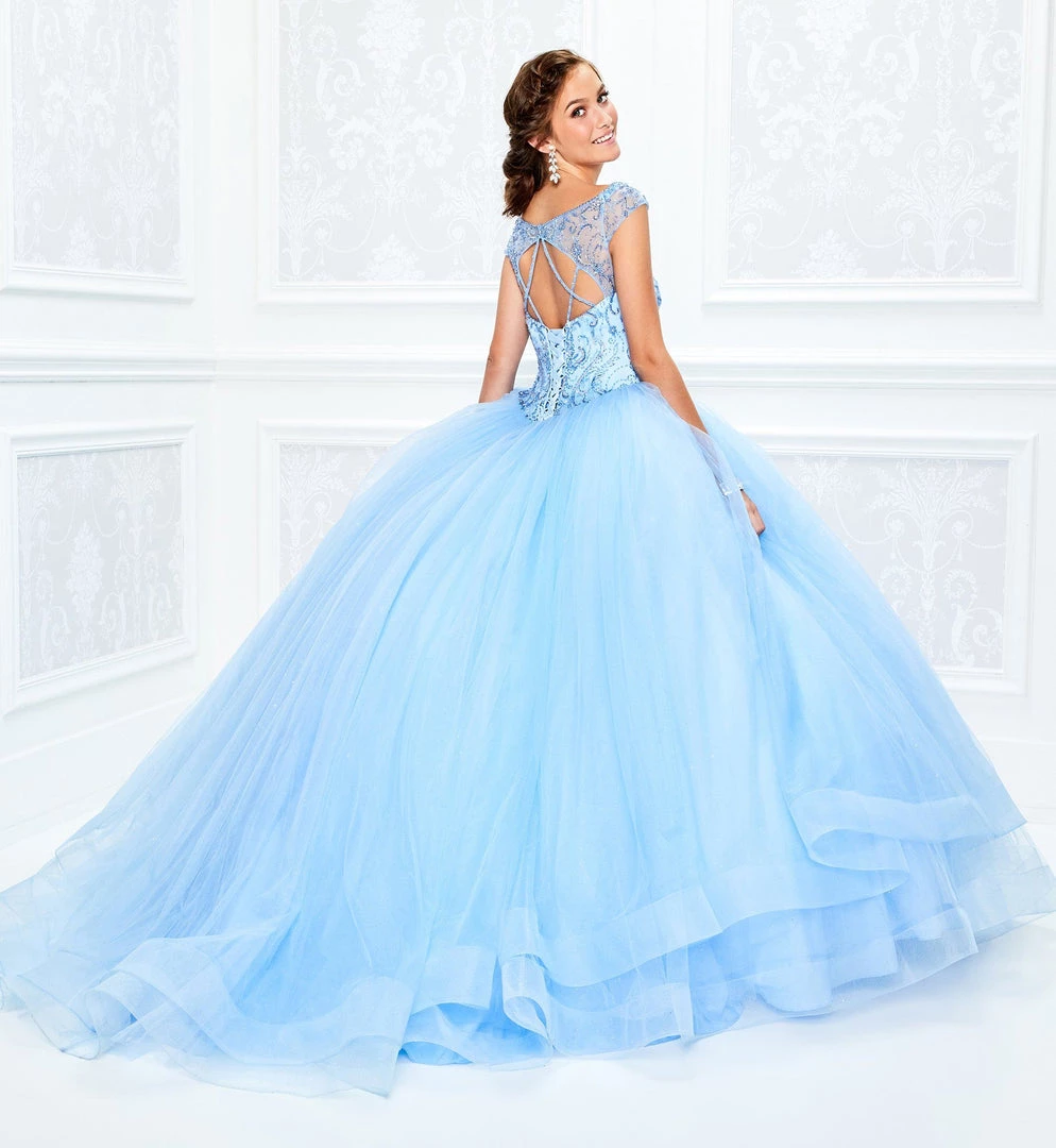 Light up the room in this beaded long illusion cap sleeve dress with A-line skirt by Princesa by Ariana Vara PR11935. Made out of sparkle tulle, this beautiful cap sleeve ball gown features a beaded illusion bateau neckline, sweetheart bodice with basque waist, beaded illusion keyhole back with beaded crisscross straps, lace up corset back, horsehair hem, and a chapel train. Matching bolero jacket is included.