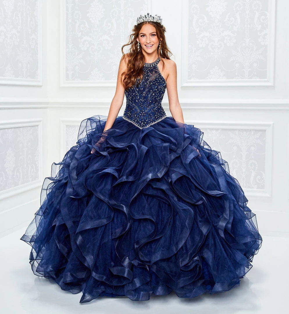 Dance the night away in this beaded long sheer halter dress with A-line ruffled skirt by Princesa by Ariana Vara PR11940. Made out of tulle, this beautiful sleeveless ball gown features a beaded illusion rounded halter neckline, deep plunging sweetheart bodice with beaded appliques, beaded basque waistline, illusion lace keyhole back with lace up corset finish, and ruffled skirt with horsehair trim. Matching bolero jacket is included.