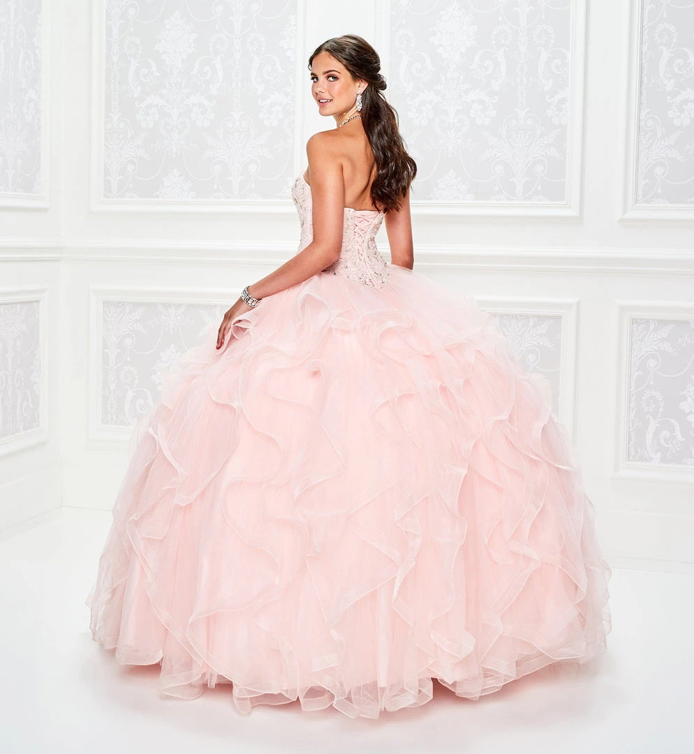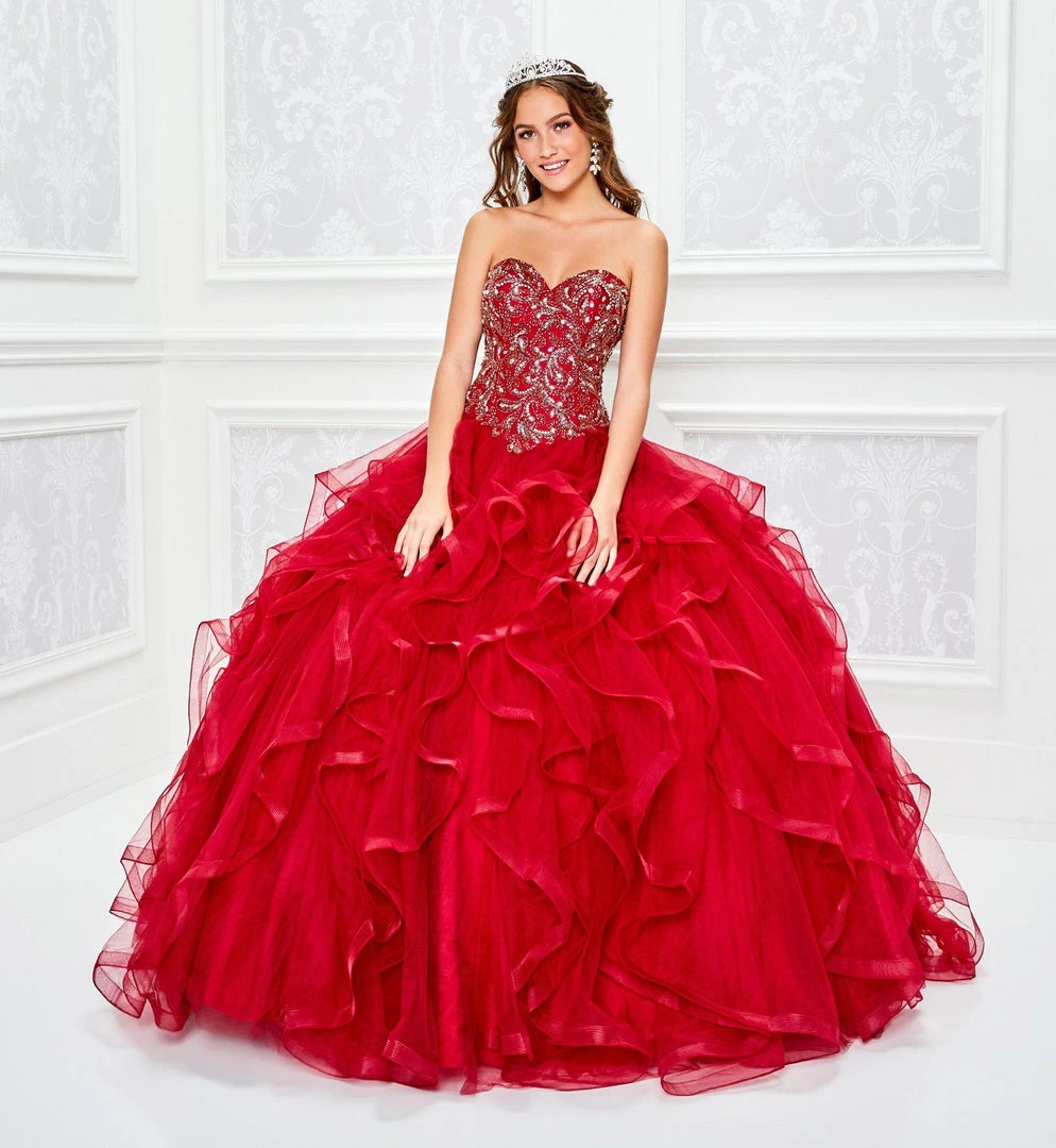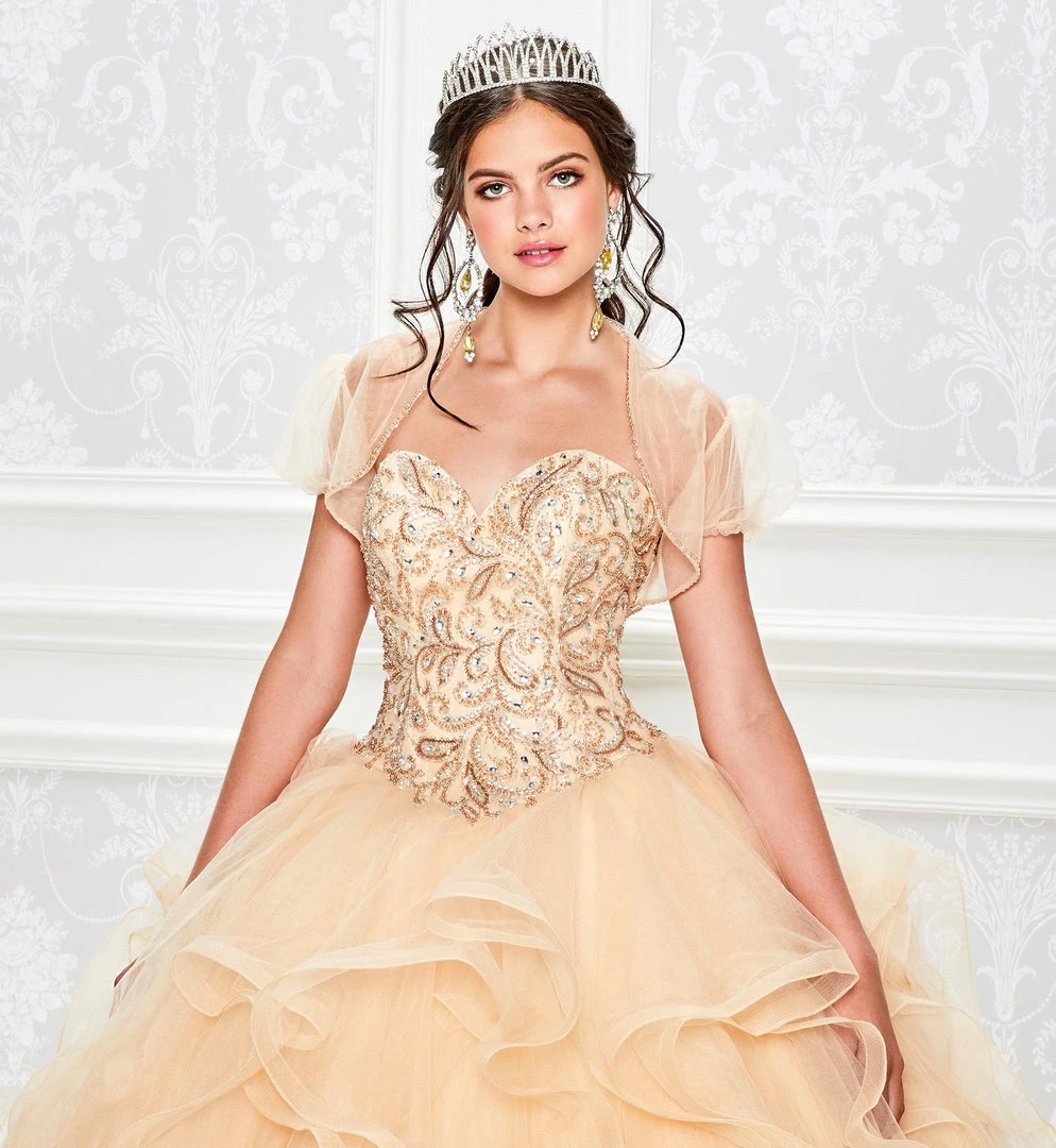 Captivate the room in this beaded long strapless sweetheart dress with A-line ruffled skirt by Princesa by Ariana Vara PR11943. Made out of tulle, this beautiful strapless ball gown features beaded basque waist, lace up corset back, and full ruffled skirt with thin horsehair trim. Matching shawl, beaded bolero jacket with puff sleeves, and removable straps are included.