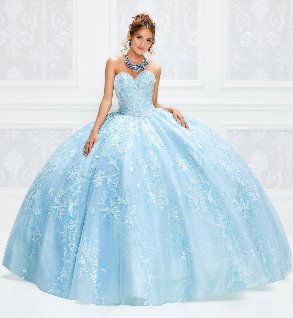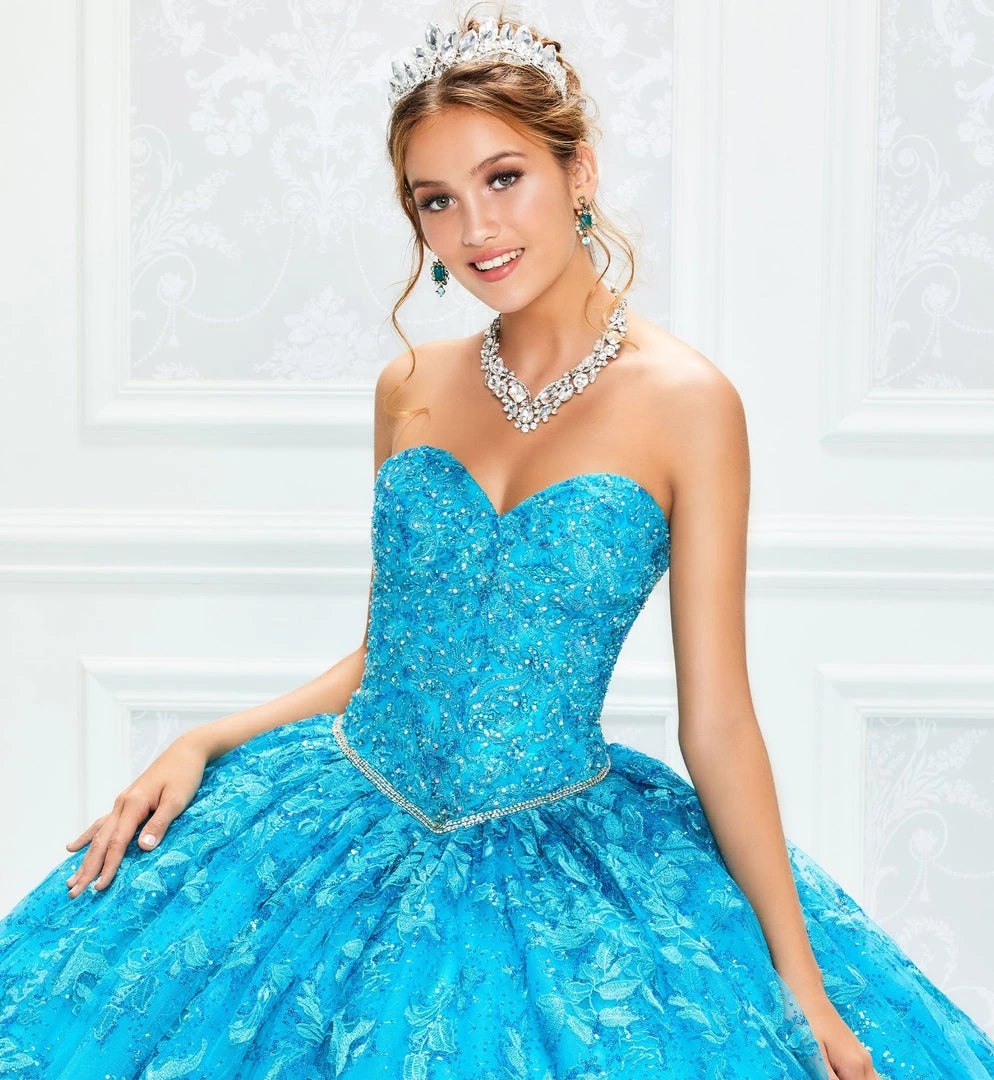 Dance the night away in this long strapless lace dress with A-line skirt by Princesa by Ariana Vara PR12005. Made out of embroidered lace, this beautiful strapless ball gown features a beaded sweetheart bodice, basque waist, lace-up corset back, a full skirt, and a sweep train. Matching bolero jacket, ruffle neckband, and puffy sleeve are included.