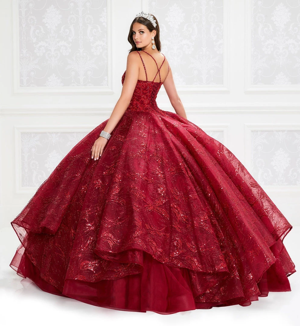 Light up the room in this long sleeveless V-neck glitter dress with A-line tiered skirt by Princesa by Ariana Vara PR12006. Made out of cracked ice, this beautiful sleeveless ball gown features a beaded corded lace V-neck bodice, double spaghetti strap detail, stone accents throughout bodice, basque waist, crisscross open back detail, lace-up corset back, a tiered skirt with a horsehair hem detail, and a sweep train. Matching bolero jacket is included.