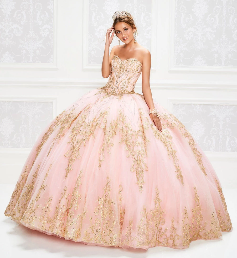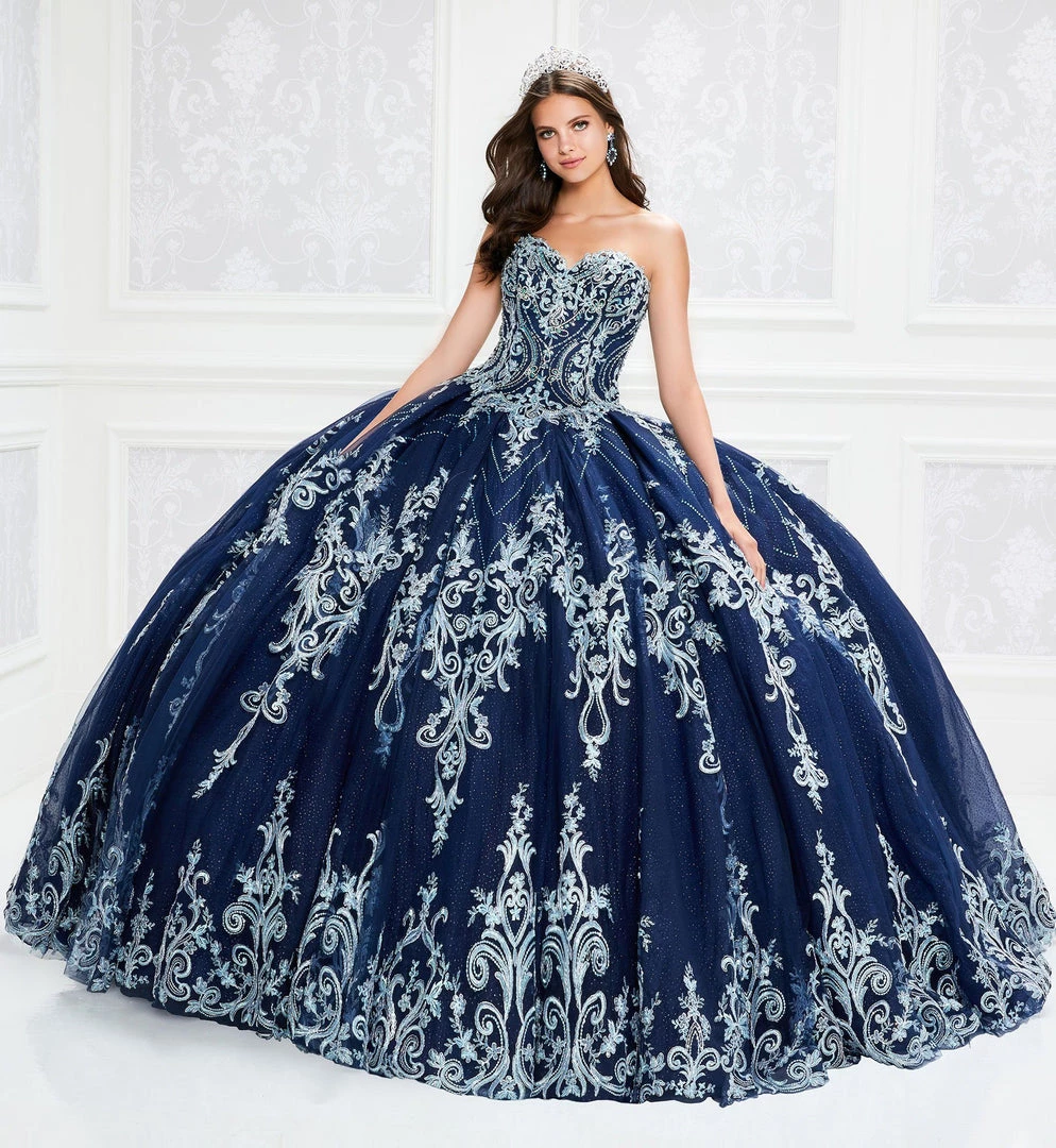 You’ll love twirling around in this embroidered long strapless glitter dress with A-line skirt by Princesa by Ariana Vara PR12015. Made out of glitter tulle, this beautiful strapless ball gown features an embroidered sweetheart bodice with stone accents, basque waist, lace-up corset back, full skirt with stone accents throughout, and a sweep train. Matching bolero jacket, sleeve band, and removable straps are included.