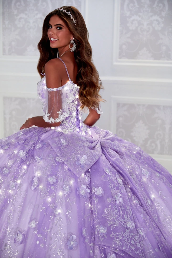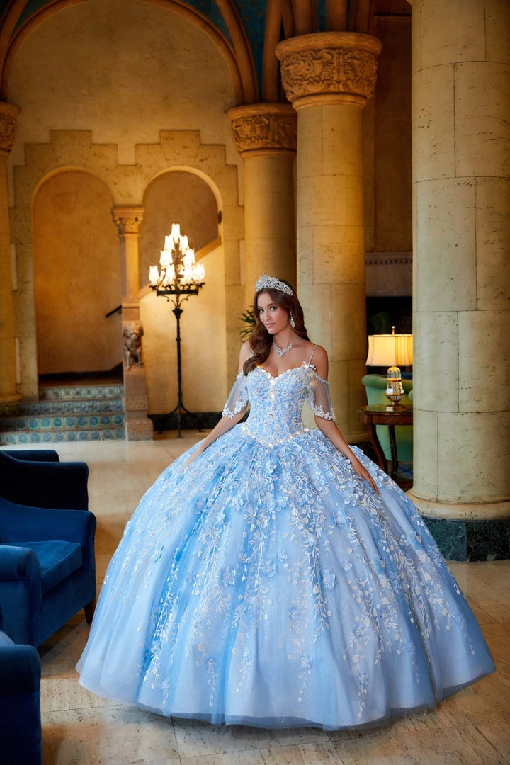 This beautiful ball gown features an off-shoulder long sleeve, sweet heart neckline, full length A-line skirt, lace up corset back, and a sweep train. Detachable Ruffle sleeve, Bolero Jacket Included, Matching color lights Included.