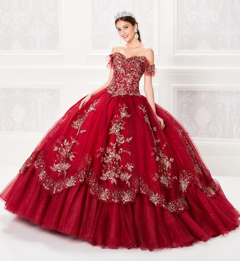 Look breathtaking in this lace applique long off the shoulder dress with A-line tiered skirt by Princesa by Ariana Vara PR21959. Made out of sparkle tulle, this beautiful off the shoulder ball gown features ruffled sleeves, sweetheart neckline, basque waist, lace-up corset back, tiered skirt with embroidered trim, a small train, and stone accents throughout. Matching tulle cape is included.
