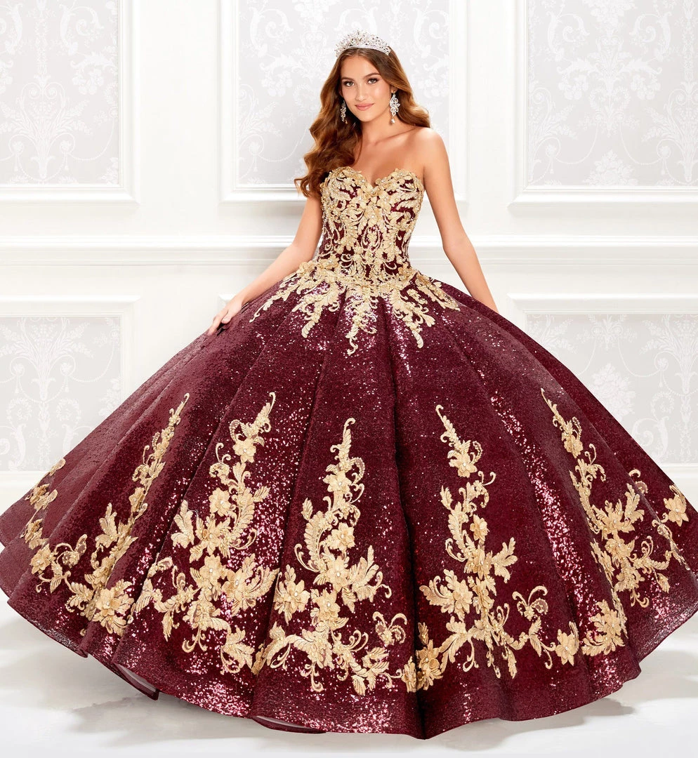 Dazzle the room in this sequined long strapless dress with A-line skirt by Princesa by Ariana Vara PR22030. Covered in sparkly sequins, this beautiful strapless ball gown features a beaded sweetheart bodice adorned with lace appliques, basque waist, lace-up corset corset back, allover stone accents, floor length A-line skirt with a horsehair hemline, and a sweep train. Matching sequin bolero jacket is included.