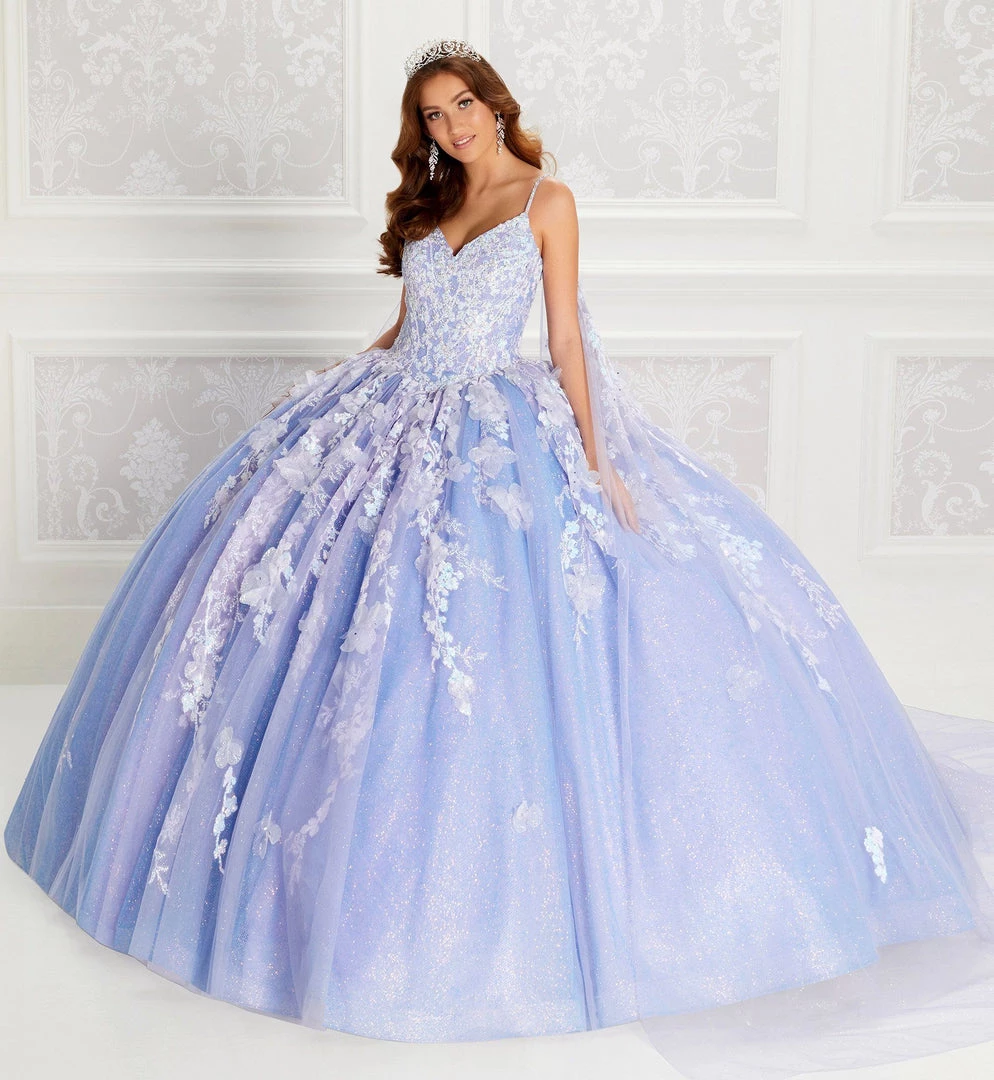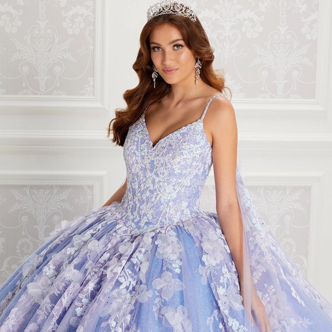 You’ll love twirling around in this 3D floral applique long cape dress with A-line skirt by Princesa by Ariana Vara PR22143. Made out of tulle, this beautiful sleeveless ball gown features a V-neckline, beaded bodice, basque waist, corset back, and detachable long cape with embroidery applique. Short cape is included.