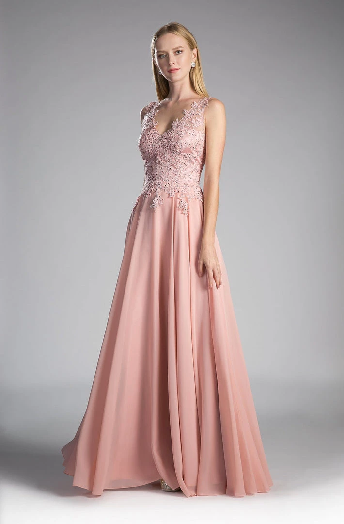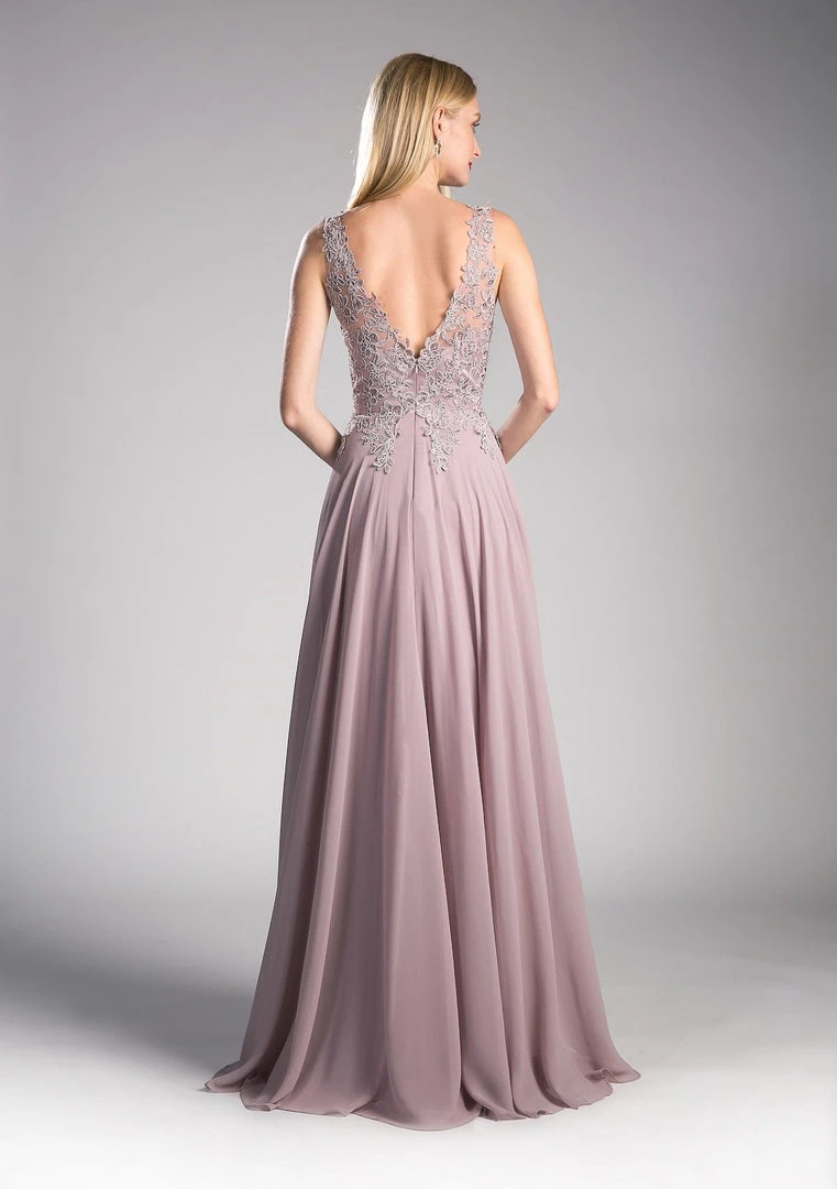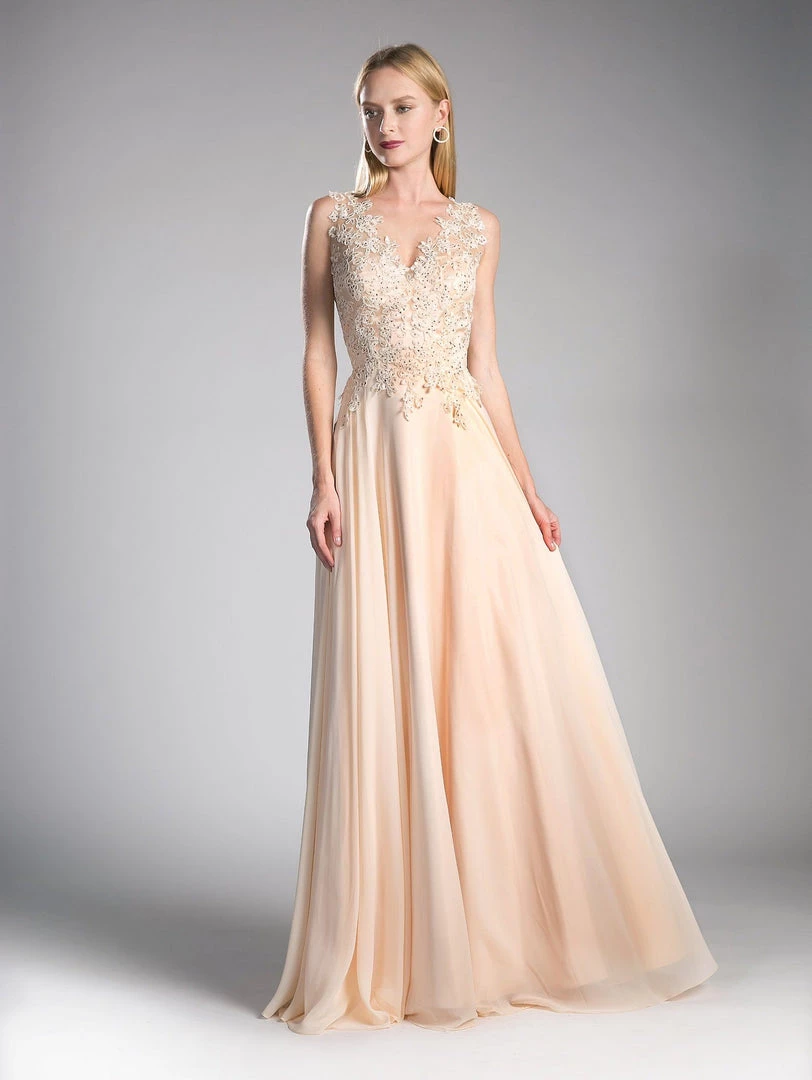 Look gorgeous in this long sleeveless V-neck dress with lace appliques by Cinderella Divine 9177. This evening gown features a sleeveless V-neck bodice with beautiful lace appliques that cascades down to the waist, V-shaped open back, floor length A-line skirt, and a zipper closure.