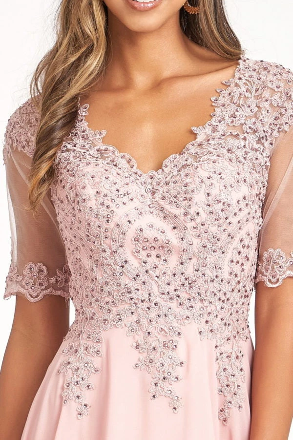 Make lasting memories in this long chiffon mid-sleeve V-neck dress with A-line slit skirt Elizabeth K GL1982.