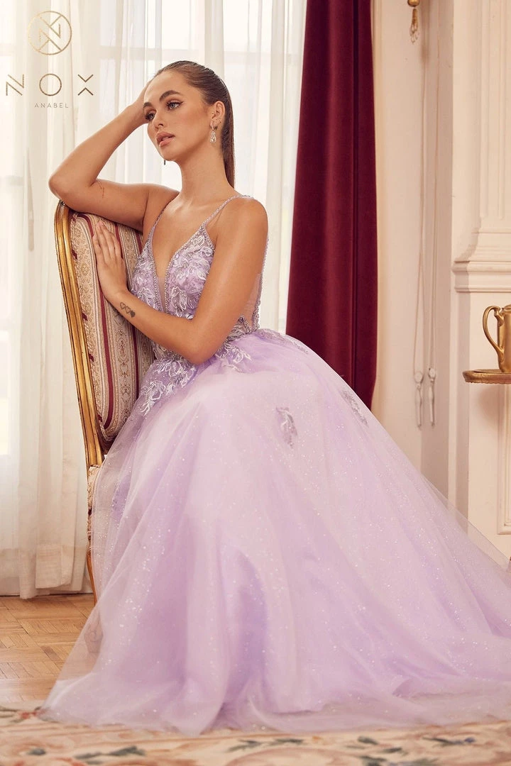 Be red carpet ready in this floral applique long sleeveless dress with A-line skirt by Nox Anabel T1012. This beautiful dress comes with illusion deep v-neck with sheer sides and sweep train.