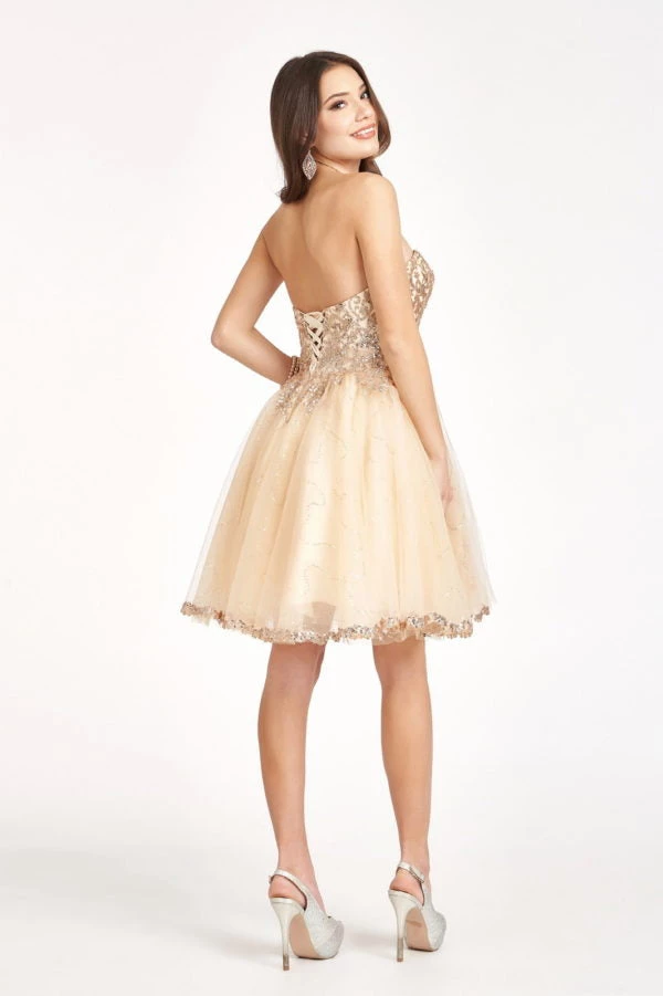 - Glitter and Sequin Embellished Bodice Sweetheart Mesh Short Dress