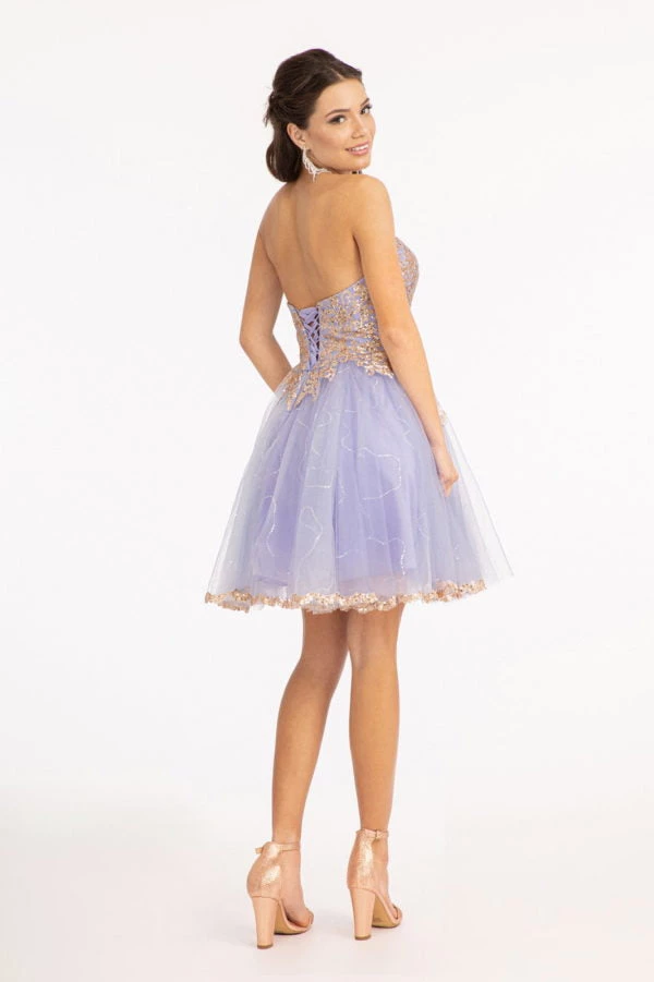 All eyes will be on you in this beaded short sweetheart dress with A-line skirt by Elizabeth K GS1980. For the most cutest girl in the world! This sequin embellished mesh short dress is decorated with sparkly glitter in splendid pattern. Strapless sweetheart neckline add romantic touch, and wide open lace-up back offers chic vibe to your look.