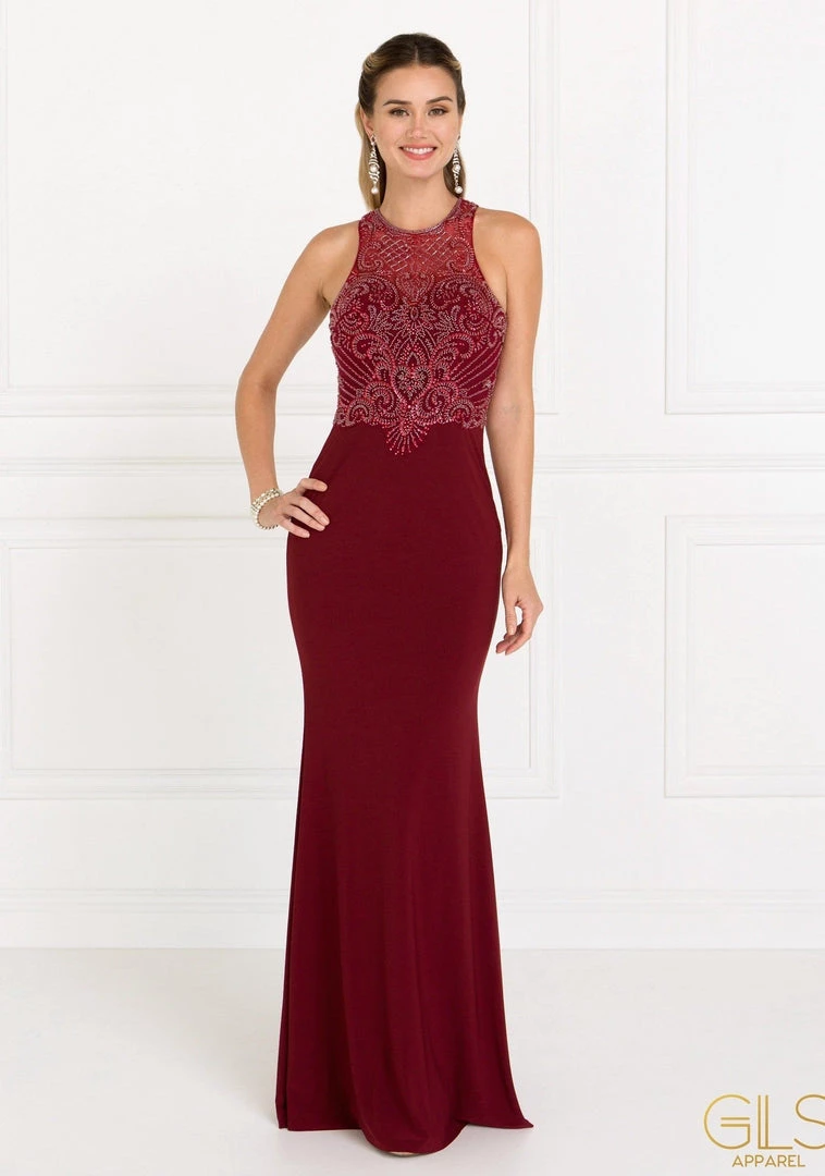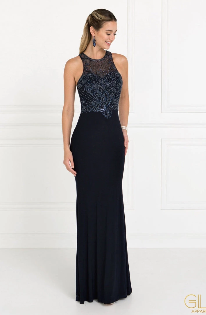 Dance the night away in this long beaded illusion champagne mermaid gown by Elizabeth K GL1507. Sleeveless jersey full length dress with an illusion sweetheart neckline on a mermaid silhouette. This beautiful gown features a mesh panel back and front cut out with embellished jewel and sequin detail. Affordably priced under $250, this dress is perfect for any formal event and will keep you on budget!
