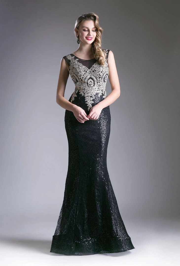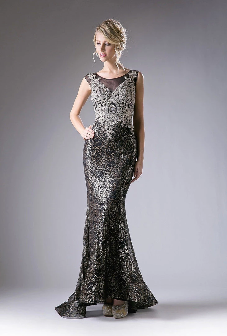 Make a grand entrance in this bead embroidered long fitted dress with appliqued sleeveless illusion bodice by Cinderella Divine 8933.