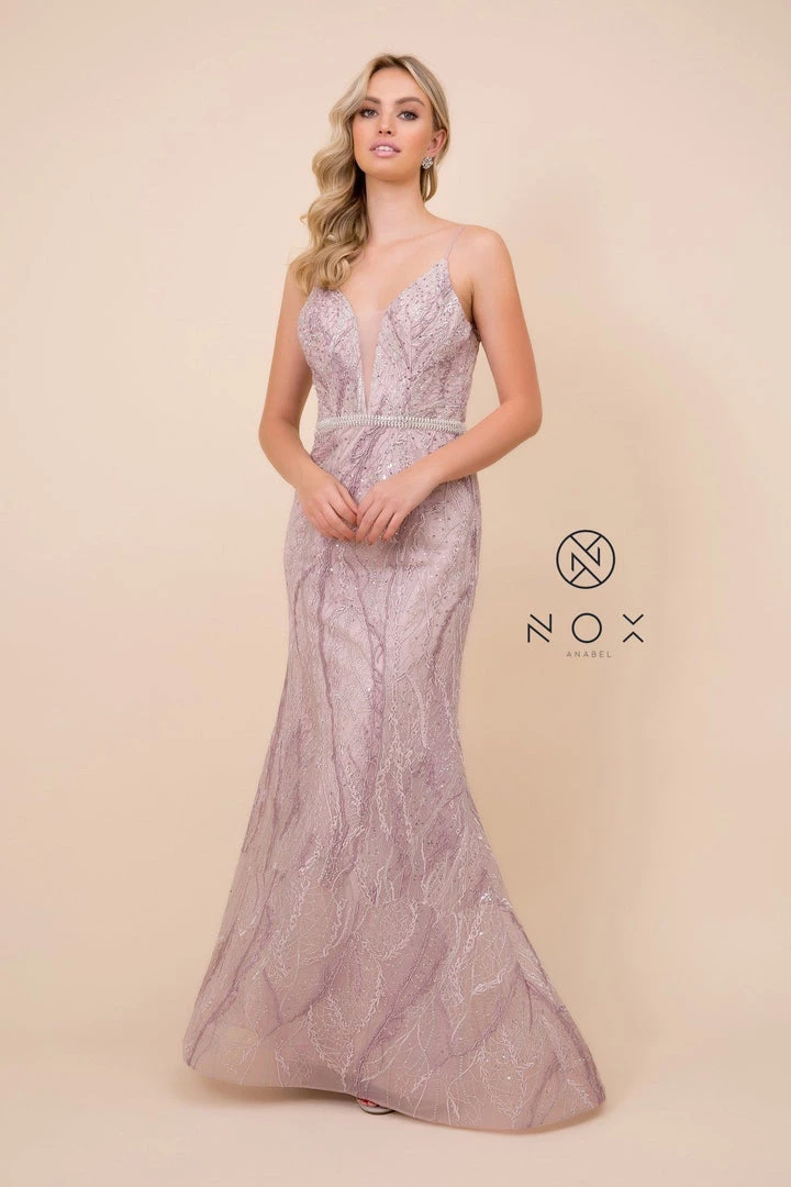 Turn heads in this embellished lace long sleeveless mermaid dress by Nox Anabel Y409.