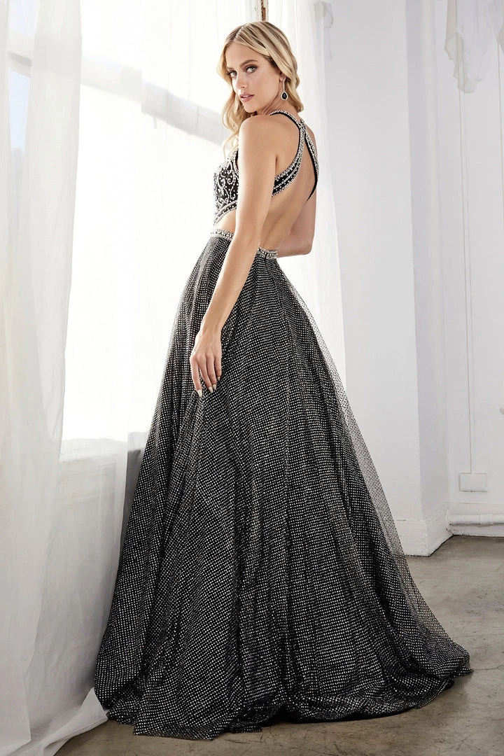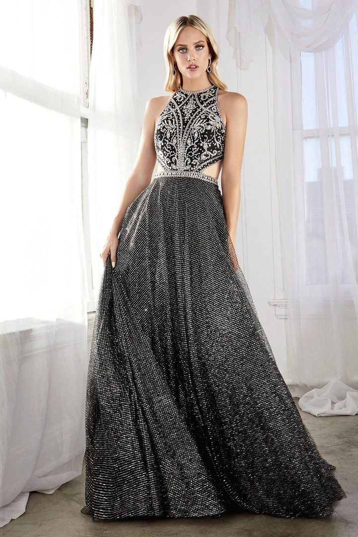 You’ll love twirling around in this bead embellished long high-neck dress by Cinderella Divine CW571.
