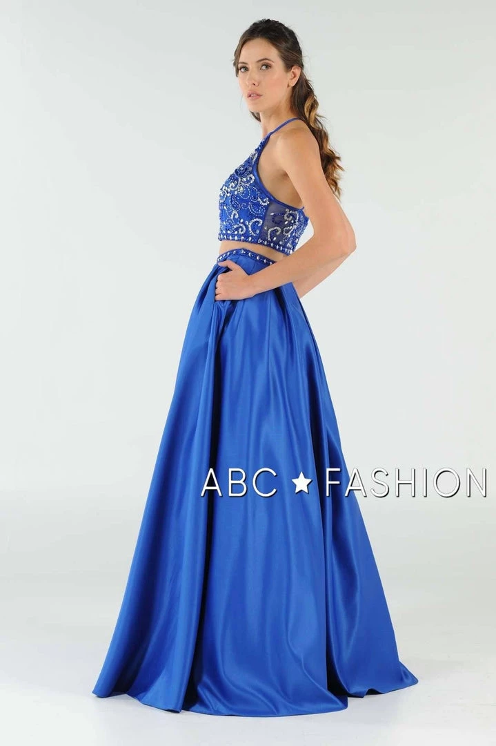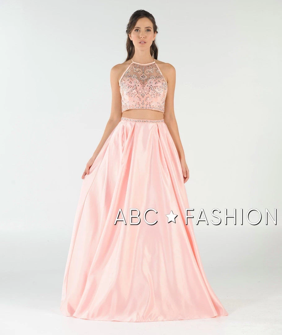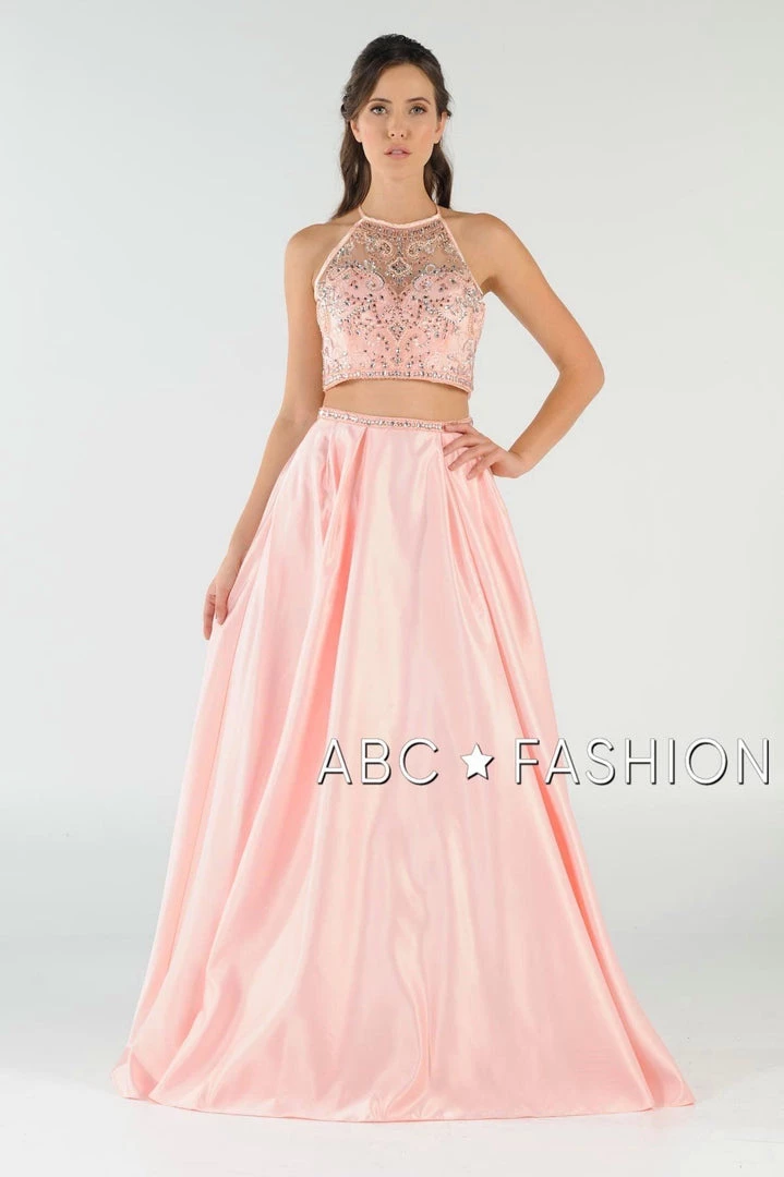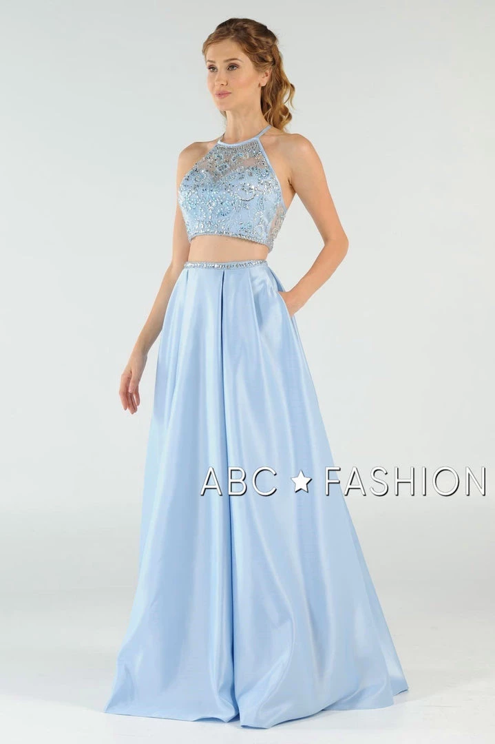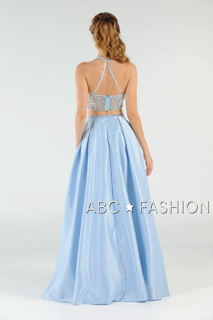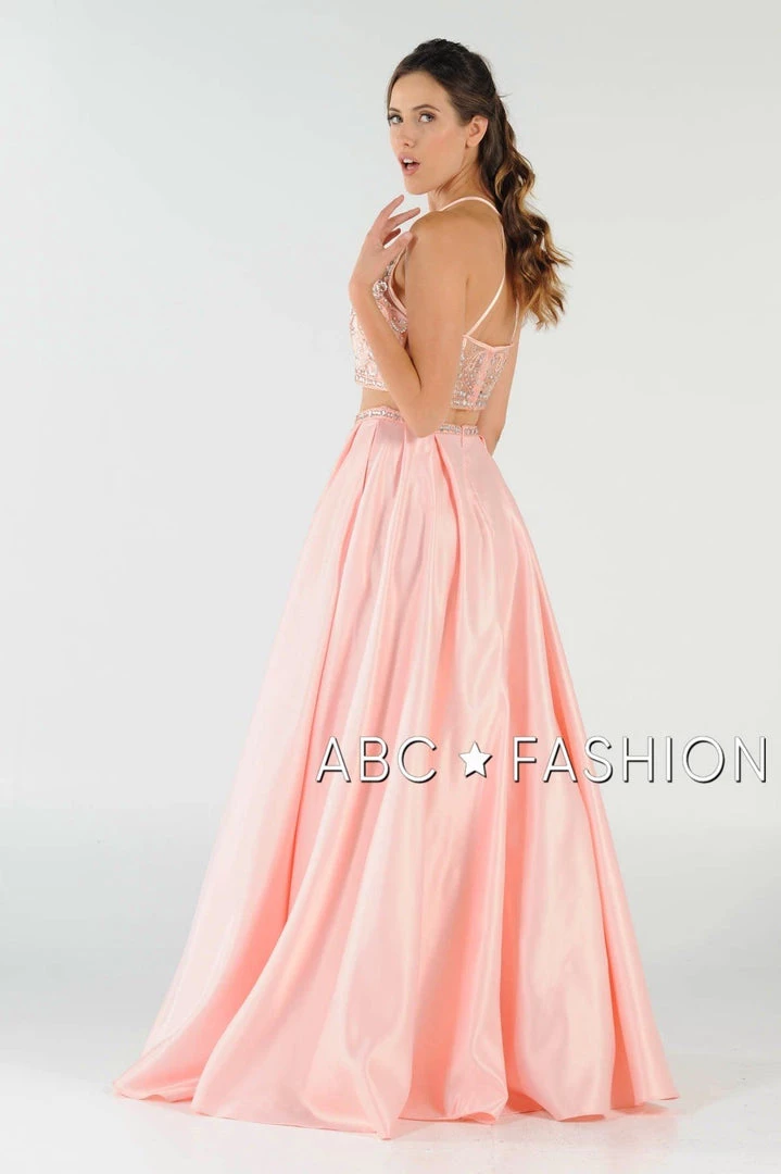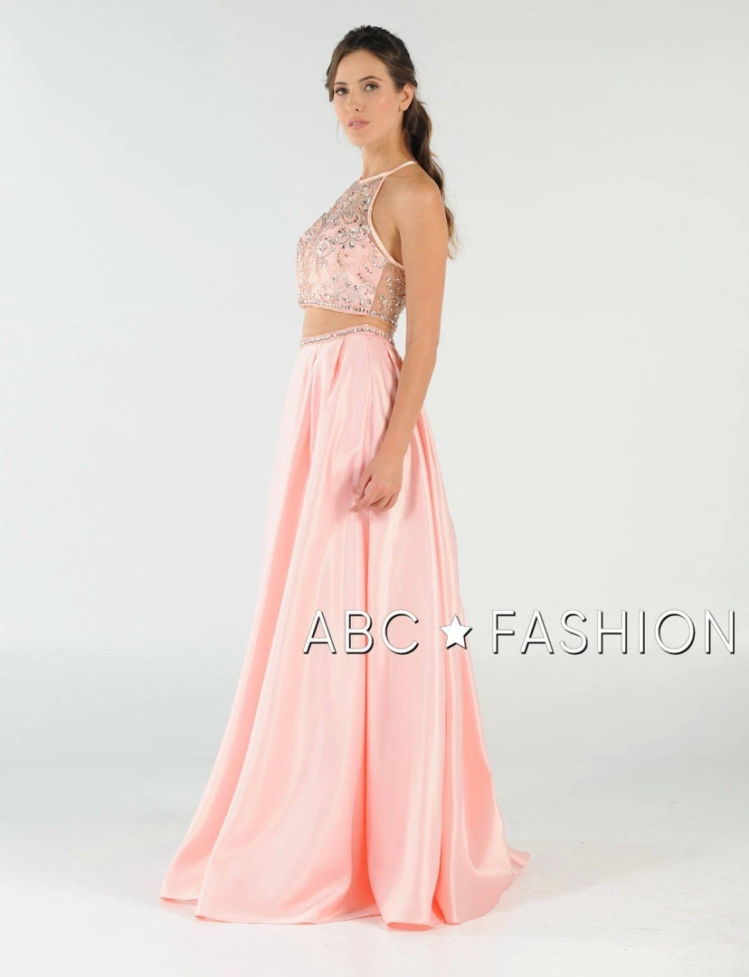 Be a trendsetter in this beaded two-piece gown with side pockets by Poly USA 8210. Gorgeous two-piece dress with sheer beaded high-neck mesh crop top, bead embellished waistline, floor length A-line satin skirt, convenient side pockets, open back with crisscross straps, and a back zipper closure. Affordably priced under $250, this dress is perfect for any formal event and will keep you on budget!