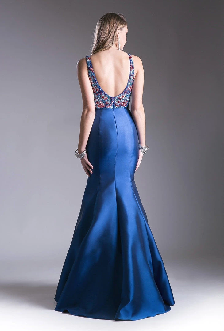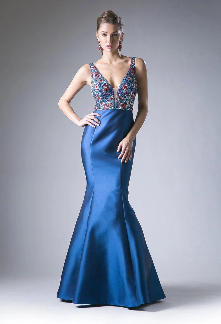 Be a trendsetter in this blue long fitted V-neck dress with beaded top by Cinderella Divine 13108.