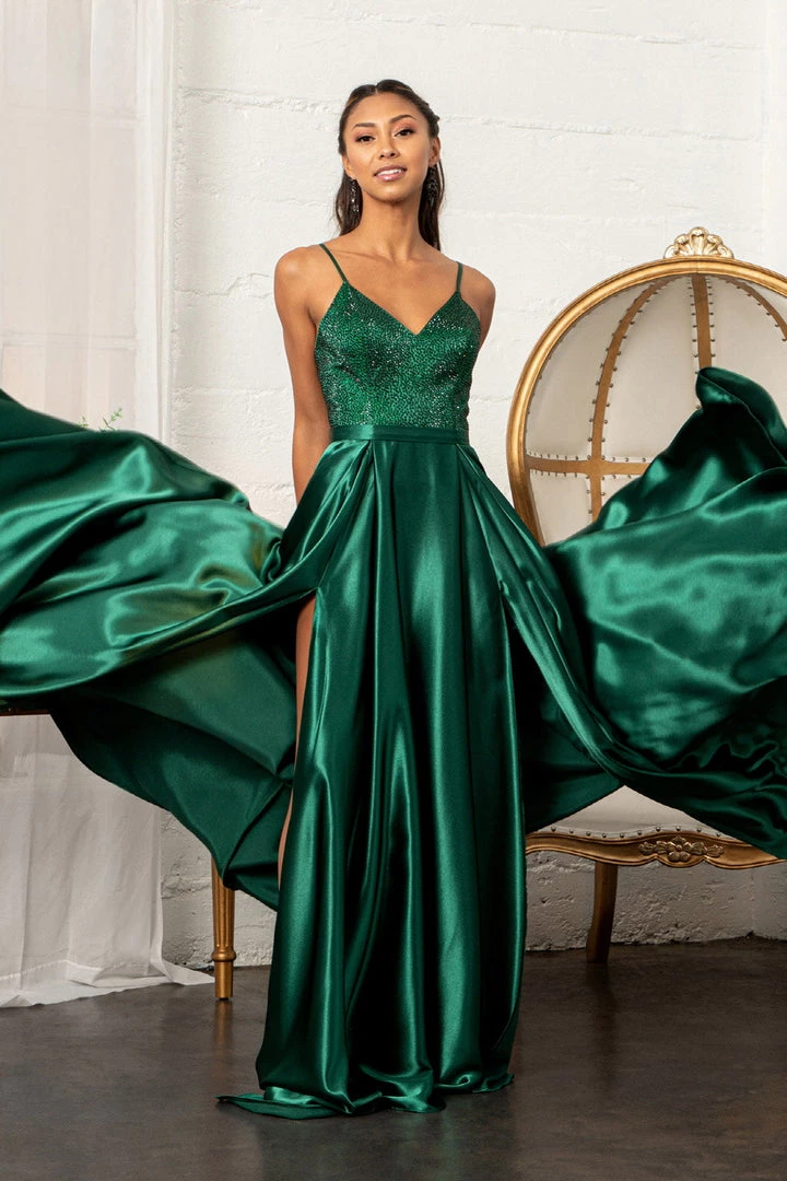 Make lasting memories in this long satin V-neck dress with A-line slit skirt Elizabeth K GL3040. This fiery satin A-line dress is decorated with sparkly jewels on bodice. Satin waistband accentuates your beautiful curves, and open strapped lace-up back adds allure to your look.