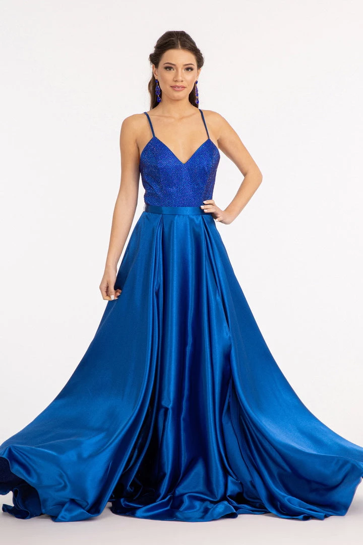 - Full Rhinestone Bodice Lace-Up Back Satin Gown with Waistband