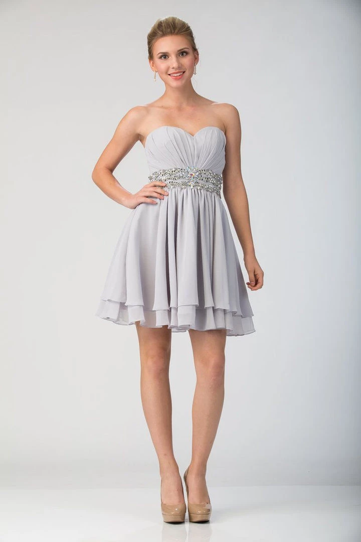 Receive lots of compliments in this beaded strapless sweetheart cocktail dress with corset back by Star Box 6133. This beautiful short empire waist dress features a ruched bodice adorned with sparkly beads, strapless sweetheart neckline, layered short A-line skirt, and a lace-up corset back with zipper closure. Affordably priced under $150, this short party dress is perfect for any formal event and will keep you on budget!